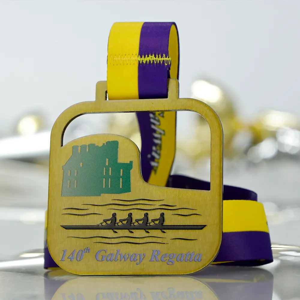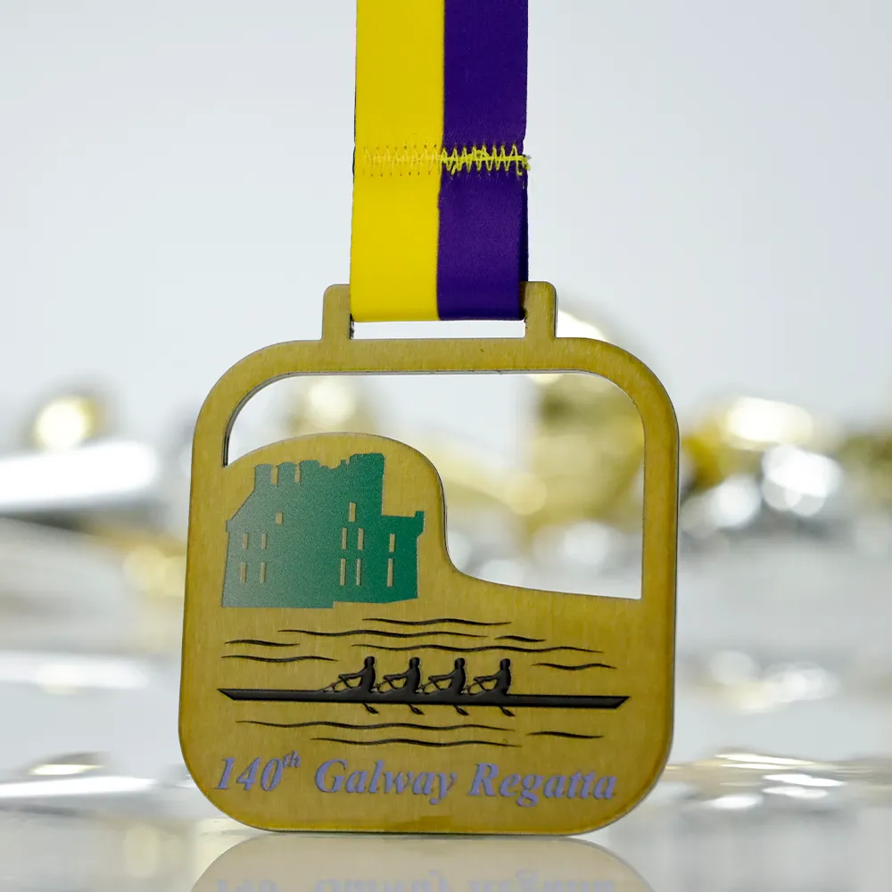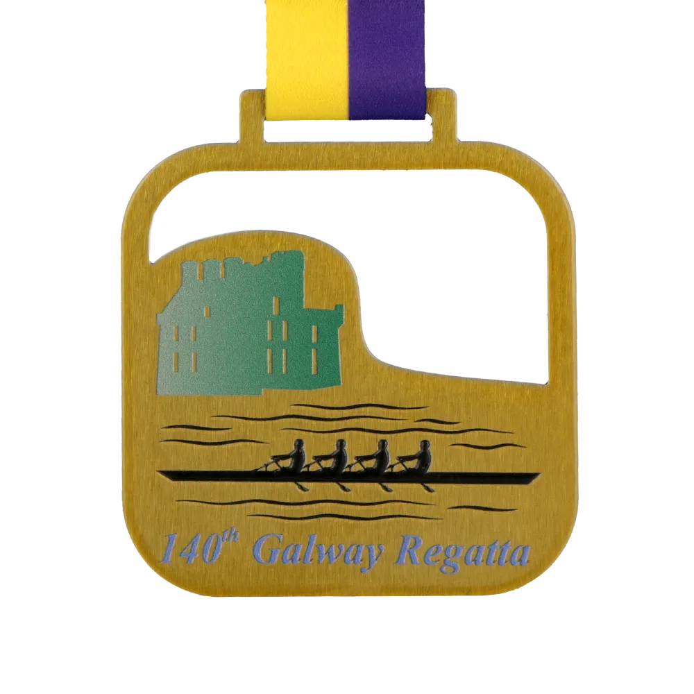 Medallas de acero impresas preparadas para la 140ª edición de la regata Galway Regatta. La forma y los recortes fueron realizados con láser en una placa metálica. Las decoraciones se aplicaron con impresión UV, mostrando siluetas de remeros, un edificio junto al agua y el nombre del evento. La medalla está acabada en dorado y colgada de una cinta bicolor.
