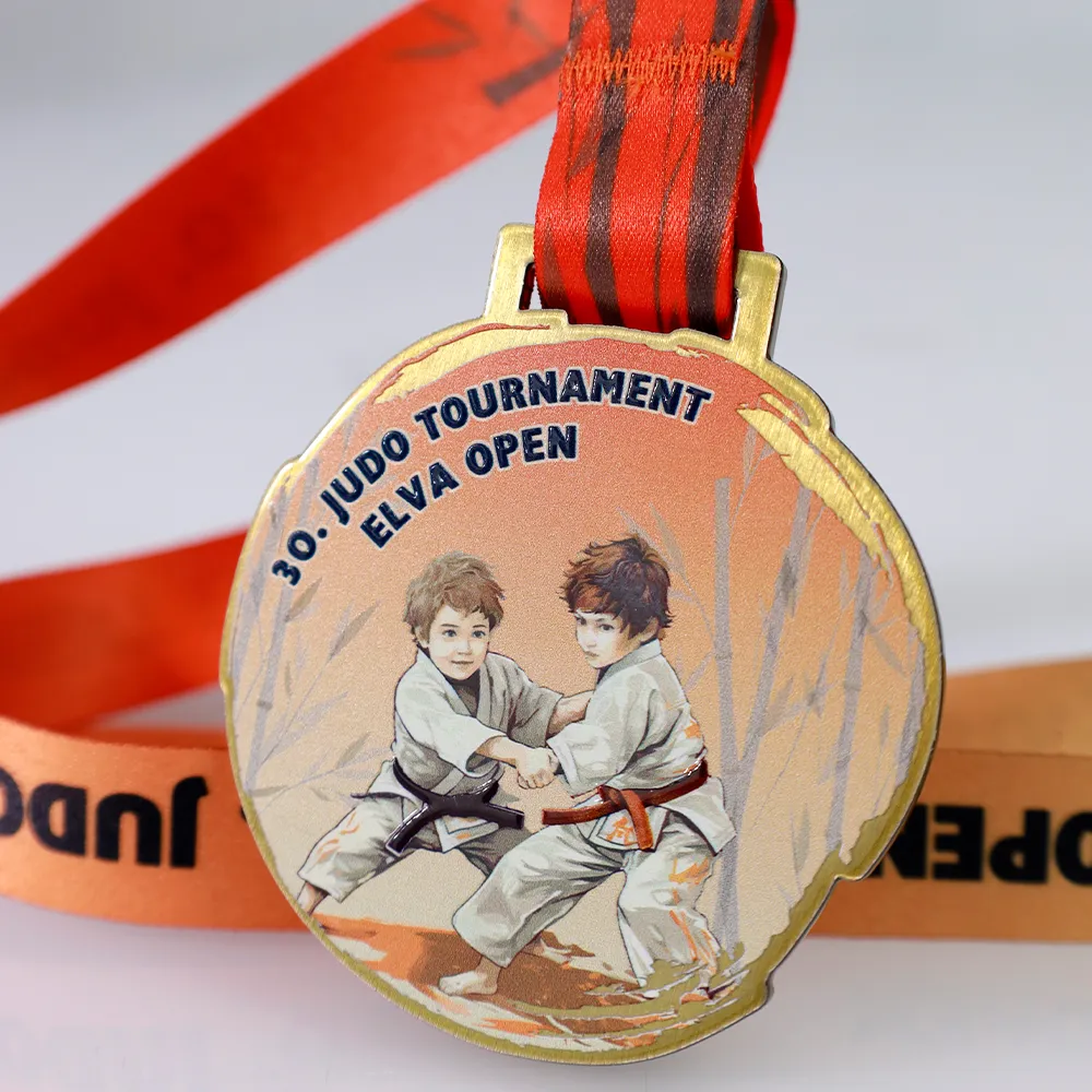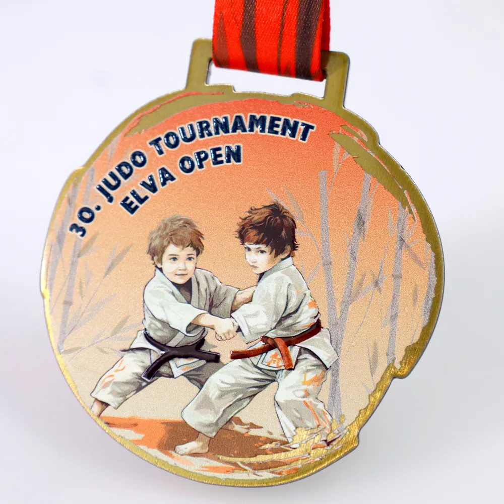 Presentamos una medalla personalizada creada específicamente para el 30º Torneo de Judo Elva Open. El anverso de la medalla presenta una imagen en color de dos jóvenes judokas en combate, capturando perfectamente el espíritu y la energía del torneo.