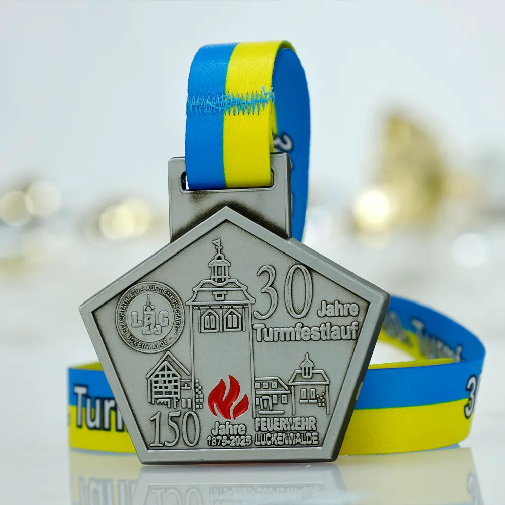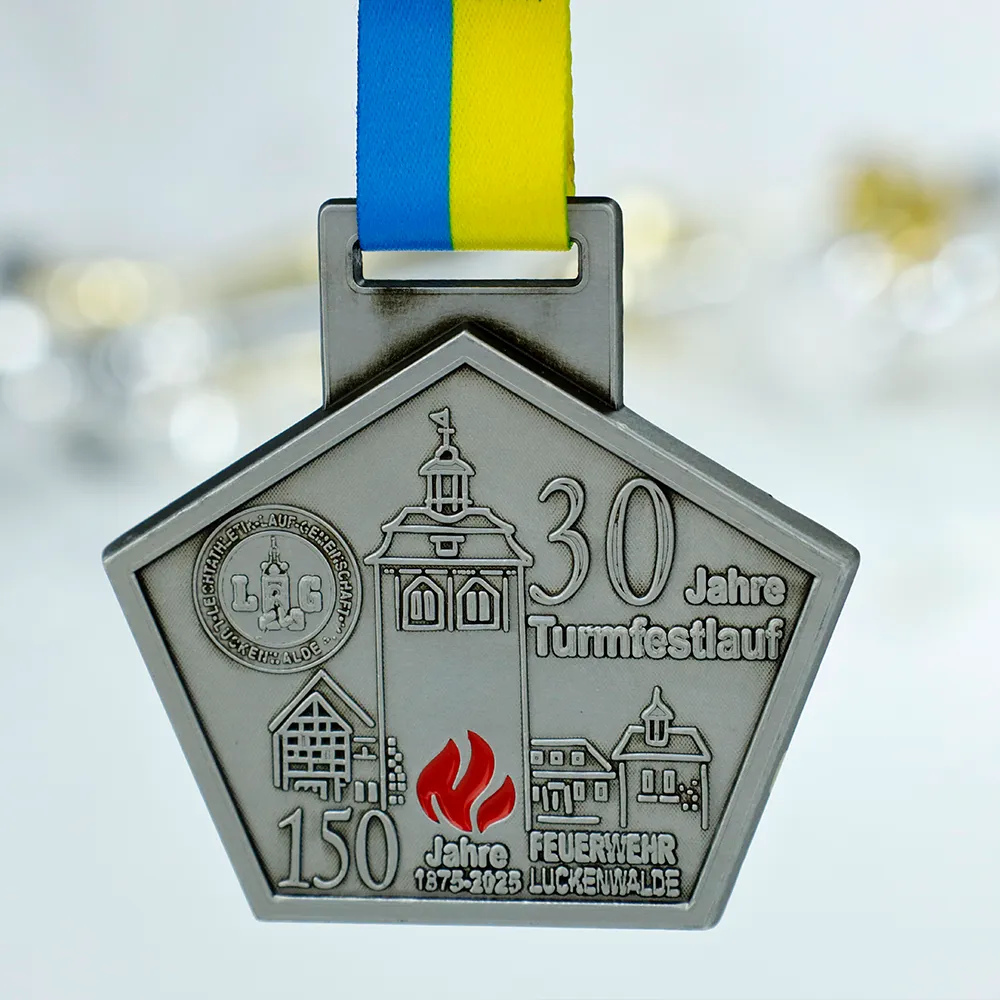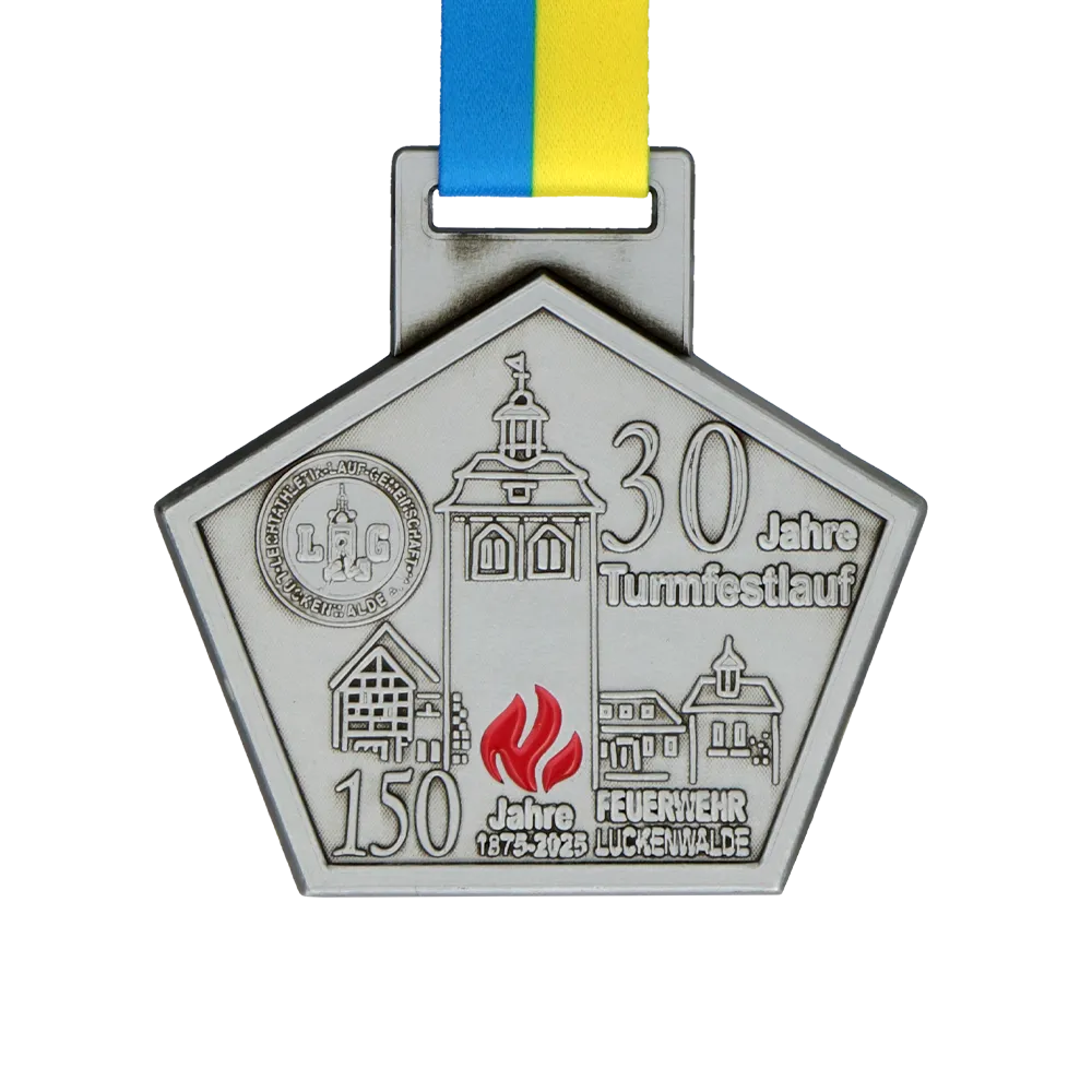 Estas medallas personalizadas se realizaron para la carrera aniversario “30 Jahre Turmfestlauf”. Tienen forma pentagonal y están fundidas en color plata. En el anverso aparecen la torre y los edificios de Luckenwalde. La medalla vincula la prueba con el 150.º aniversario del Cuerpo de Bomberos de Luckenwalde, simbolizado por un motivo de llama en esmalte rojo.