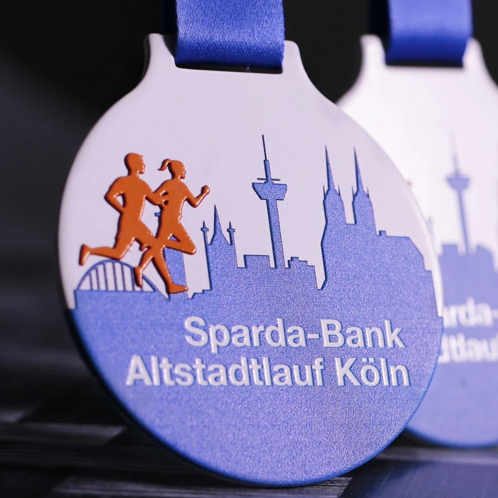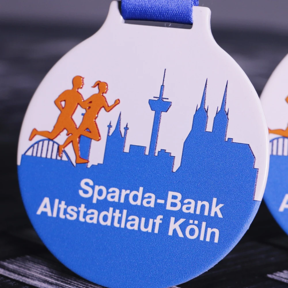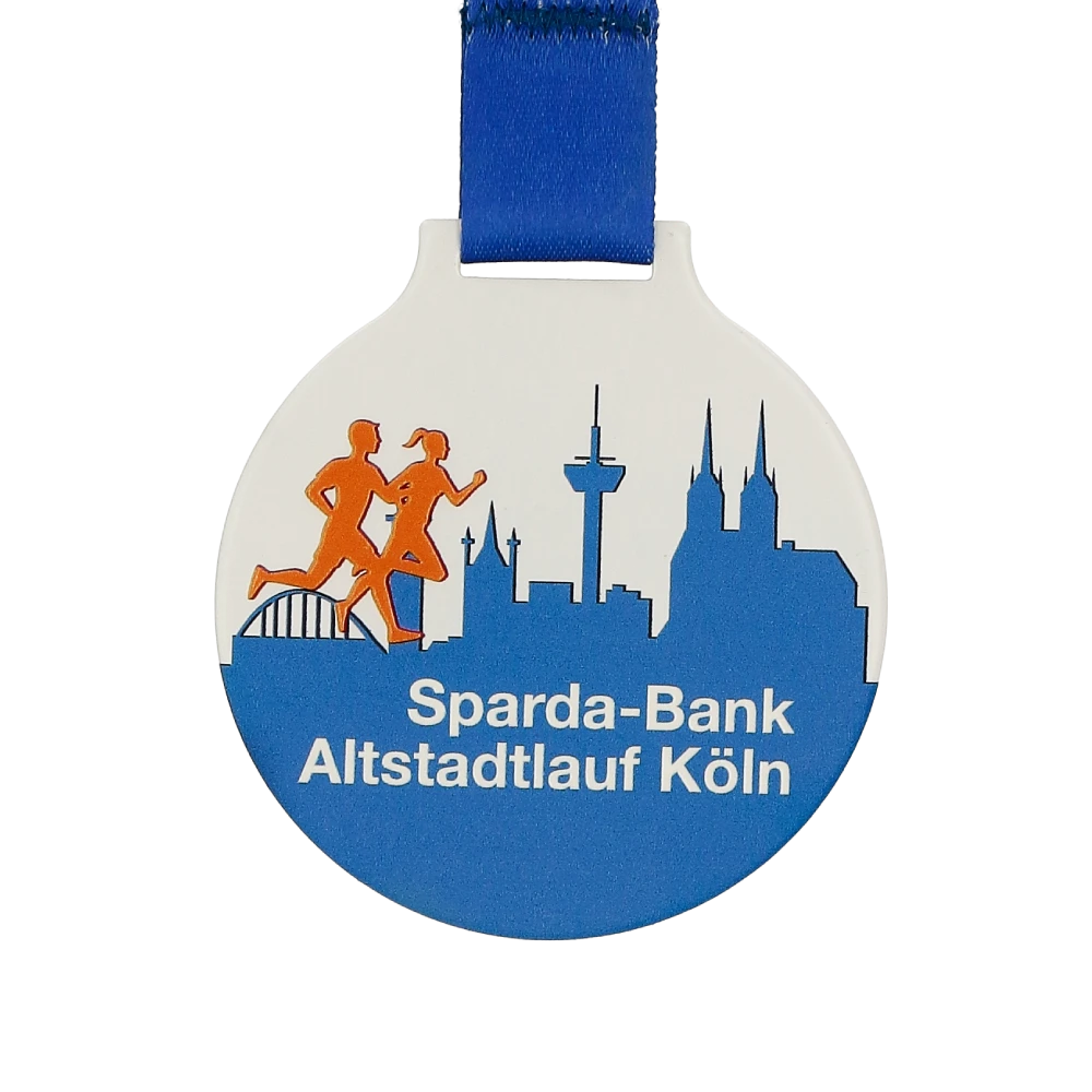 Medalla personalizada redonda, fabricada en acero. La impresión UV muestra siluetas naranjas de corredores sobre un fondo azul con la panorámica de Colonia, incluyendo el puente Hohenzollern y la catedral.