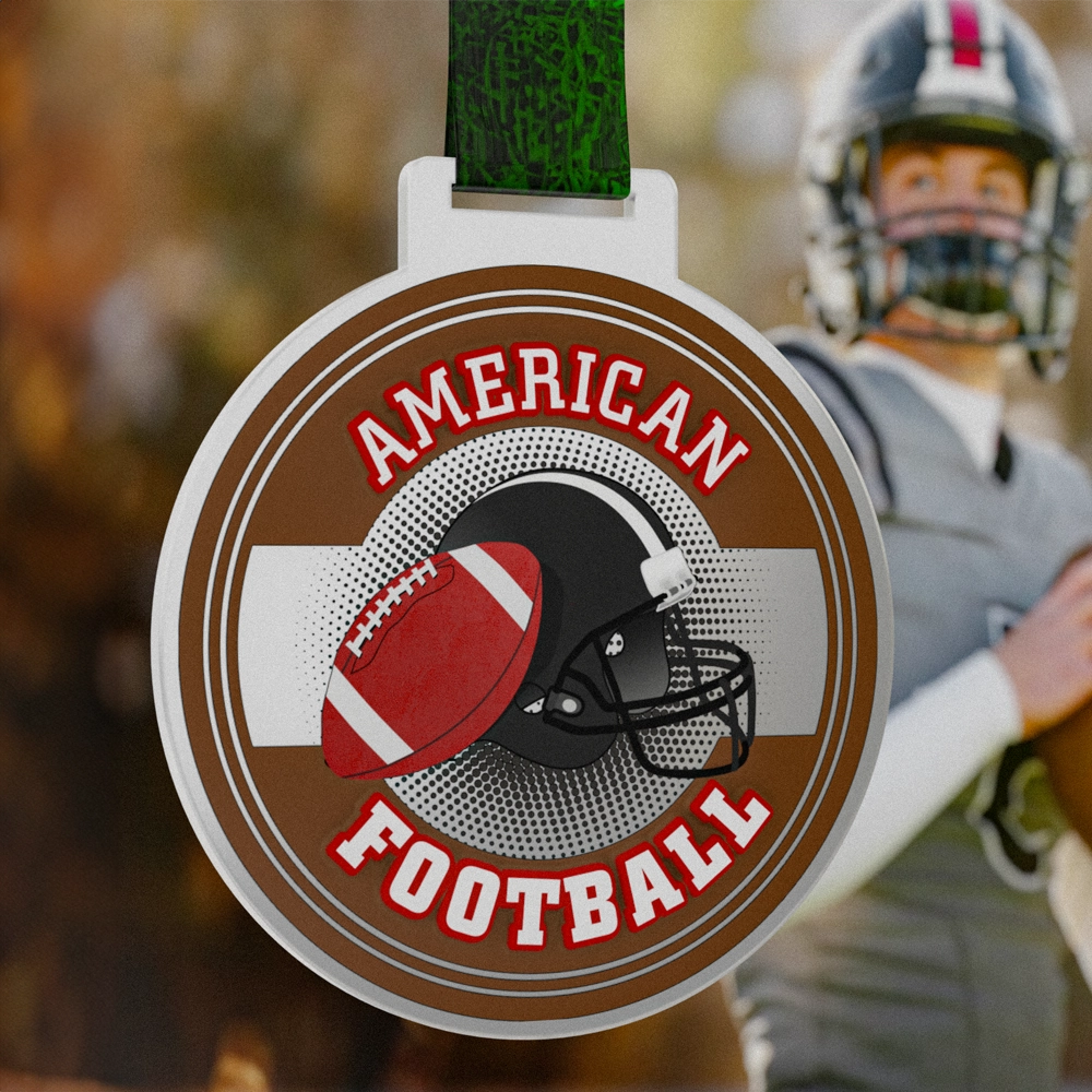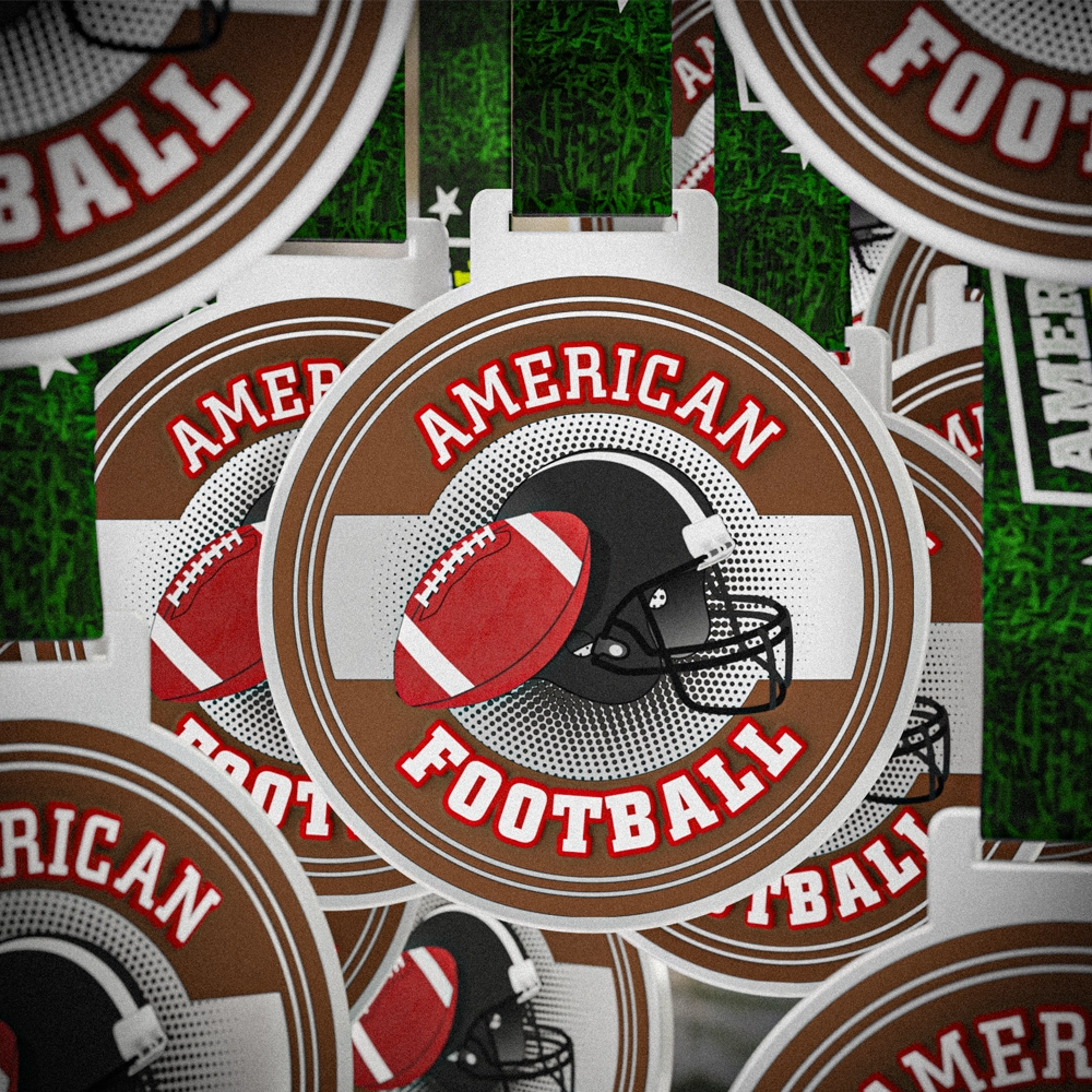 Medallas redondas cubiertas con una impresión colorida de motivo deportivo, el recuerdo perfecto de la participación en un partido de fútbol americano.
