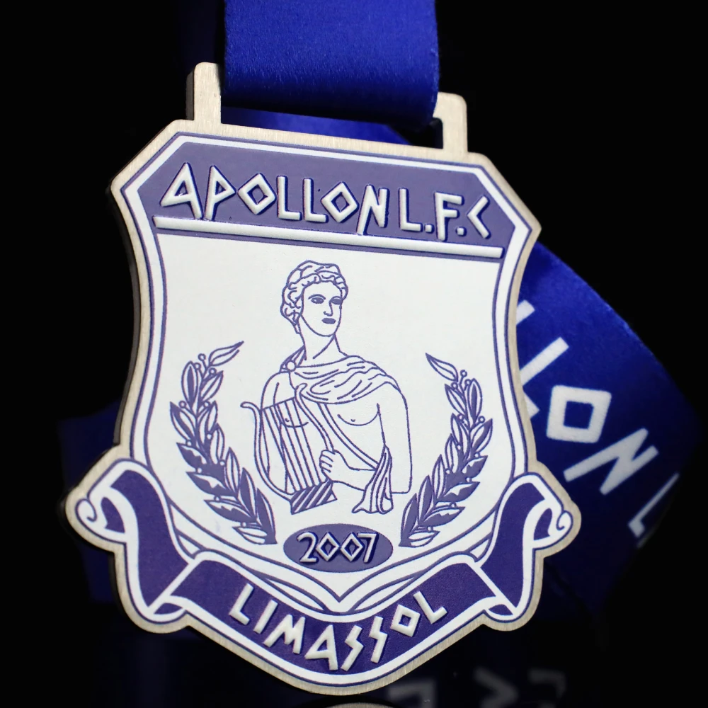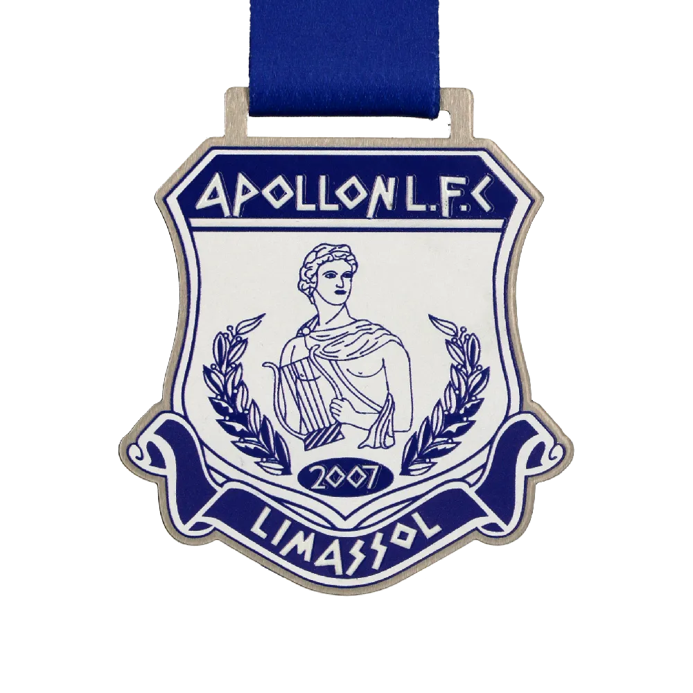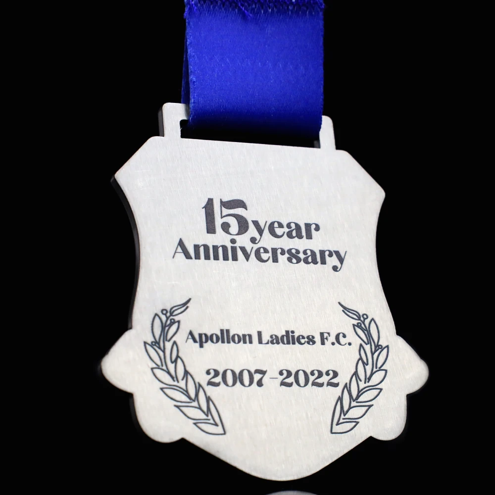 Las medallas de fútbol representan una gran parte de nuestra oferta. Es un deporte muy popular practicado por cientos de miles de personas en todo el mundo. Entre nuestros proyectos de fútbol, encontrarás expresivas medallas de acero que preparamos para el 15th Anniversary Apollon Ladies F.C. Tienen una forma original cortada con láser y presentan una impresión a color en toda su superficie. Sus intensos tonos azul marino llaman la atención y permanecen en la memoria. Además, son medallas de doble cara con decoraciones tanto en el anverso como en el reverso. Todo el conjunto se completa con una cinta de sublimación a juego con el diseño del premio.