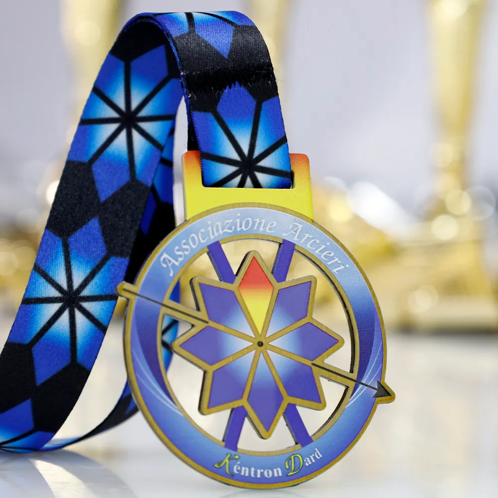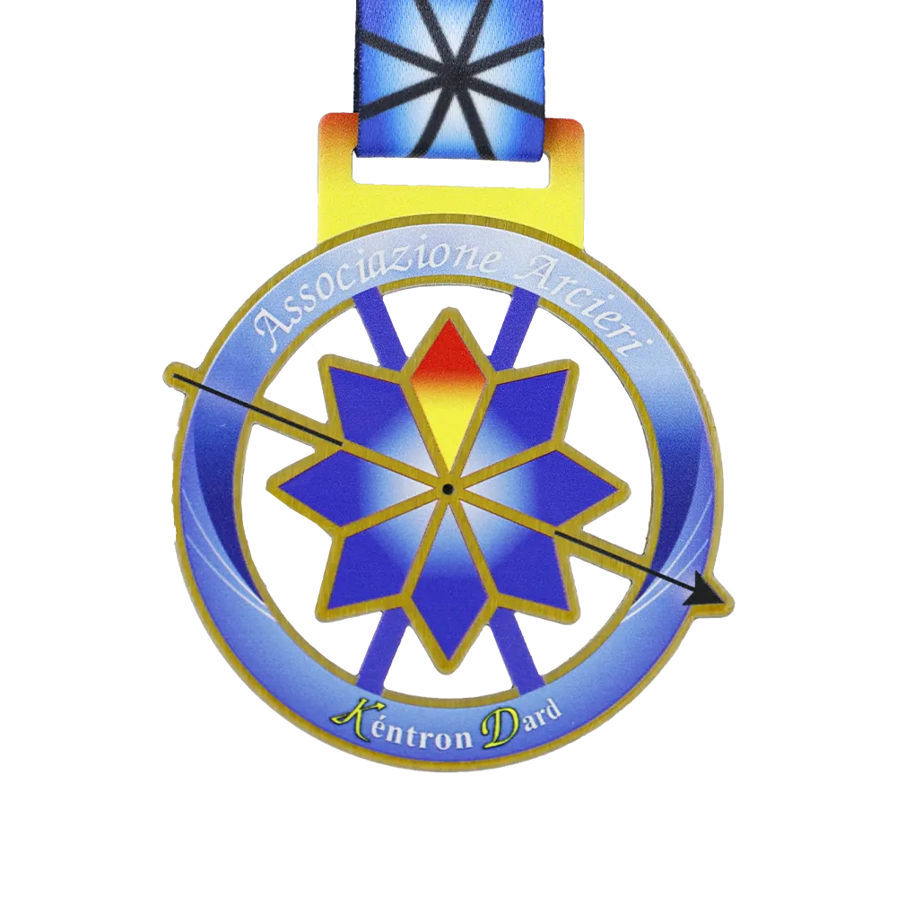 Unas medallas personalizadas dedicadas a competiciones de tiro con arco organizadas por Associazione Arcieri. El diseño muestra un blanco y una flecha en tonos de azul, dorado y rojo, realizados con impresión UV. Personalizadas con el nombre del club y el evento. Se acompañan de una cinta colorida a juego con la medalla.