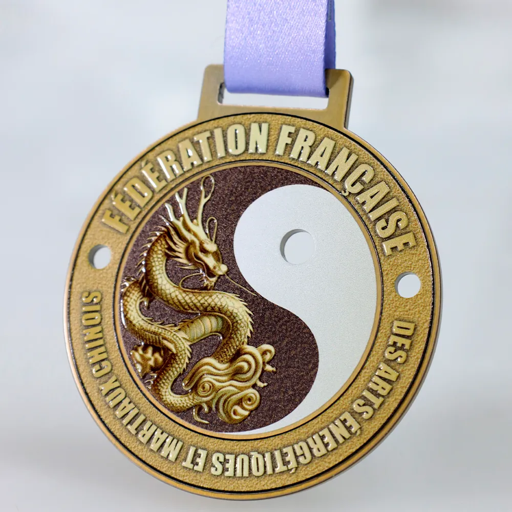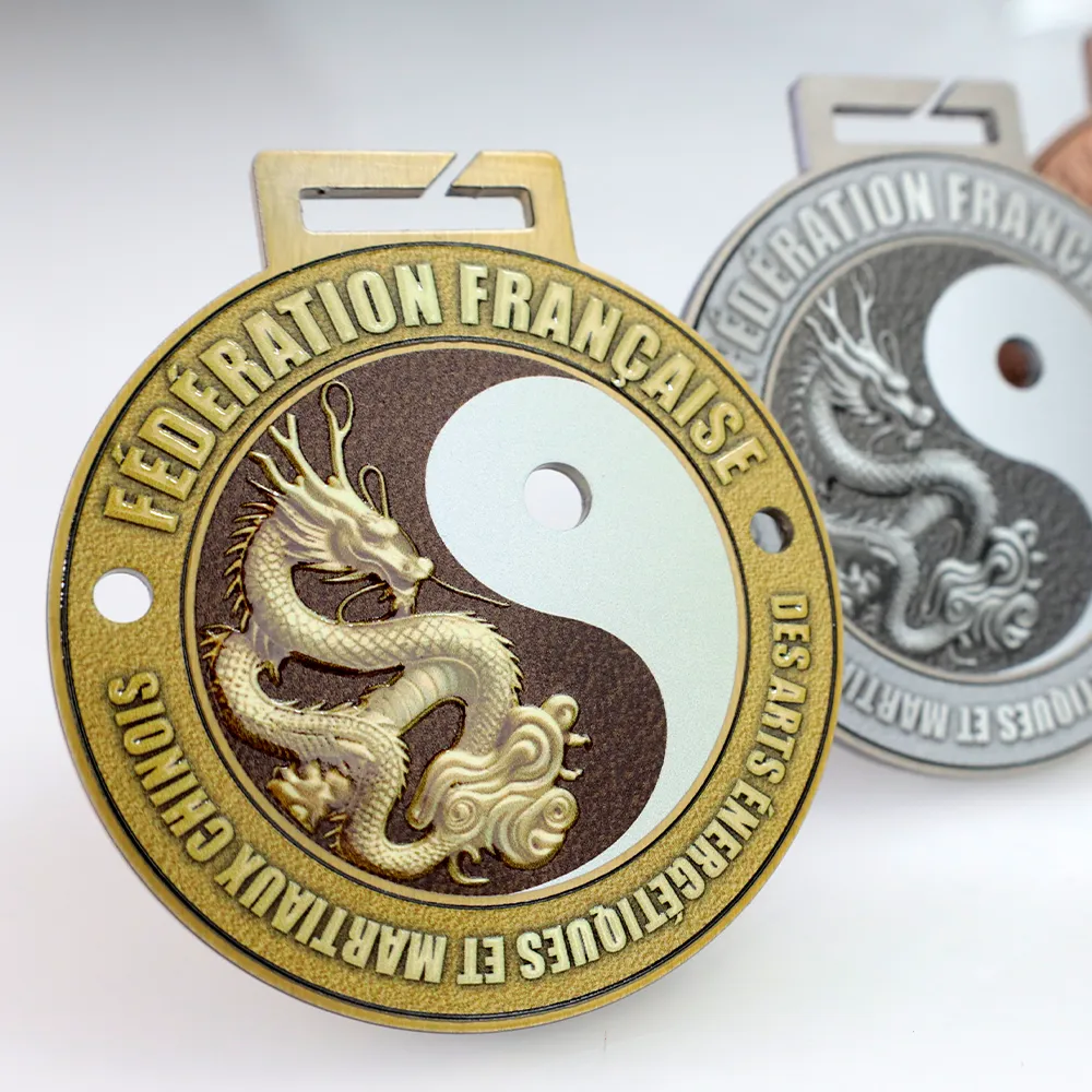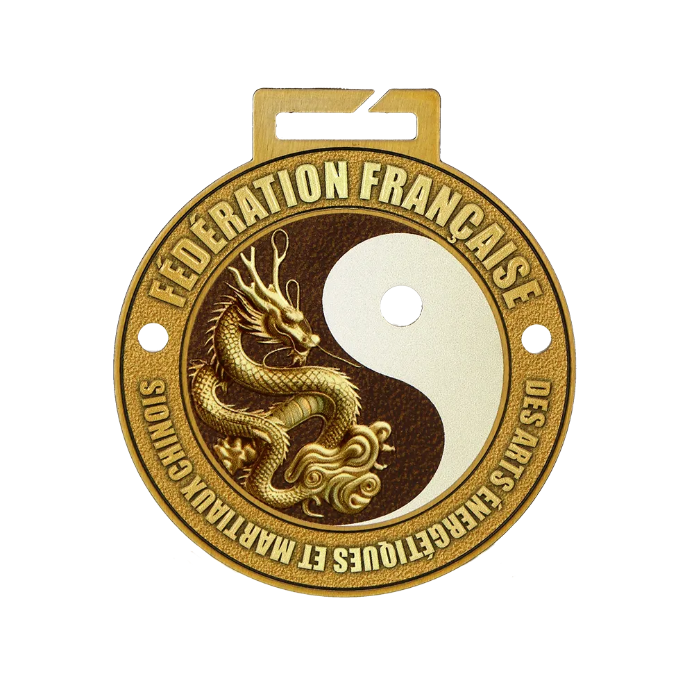 Un medalla personalizada para los participantes del torneo organizado por la Fédération Française des Arts Energétiques et Martiaux Chinois. Es una medalla de acero con la imagen de un dragón y el símbolo yin-yang. Los detalles están elaborados con gran precisión, lo que le otorga un aspecto excepcional.