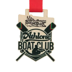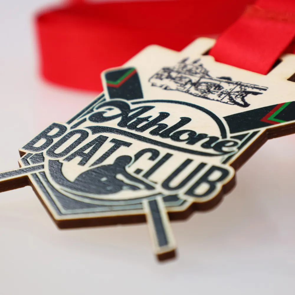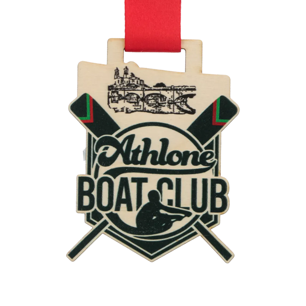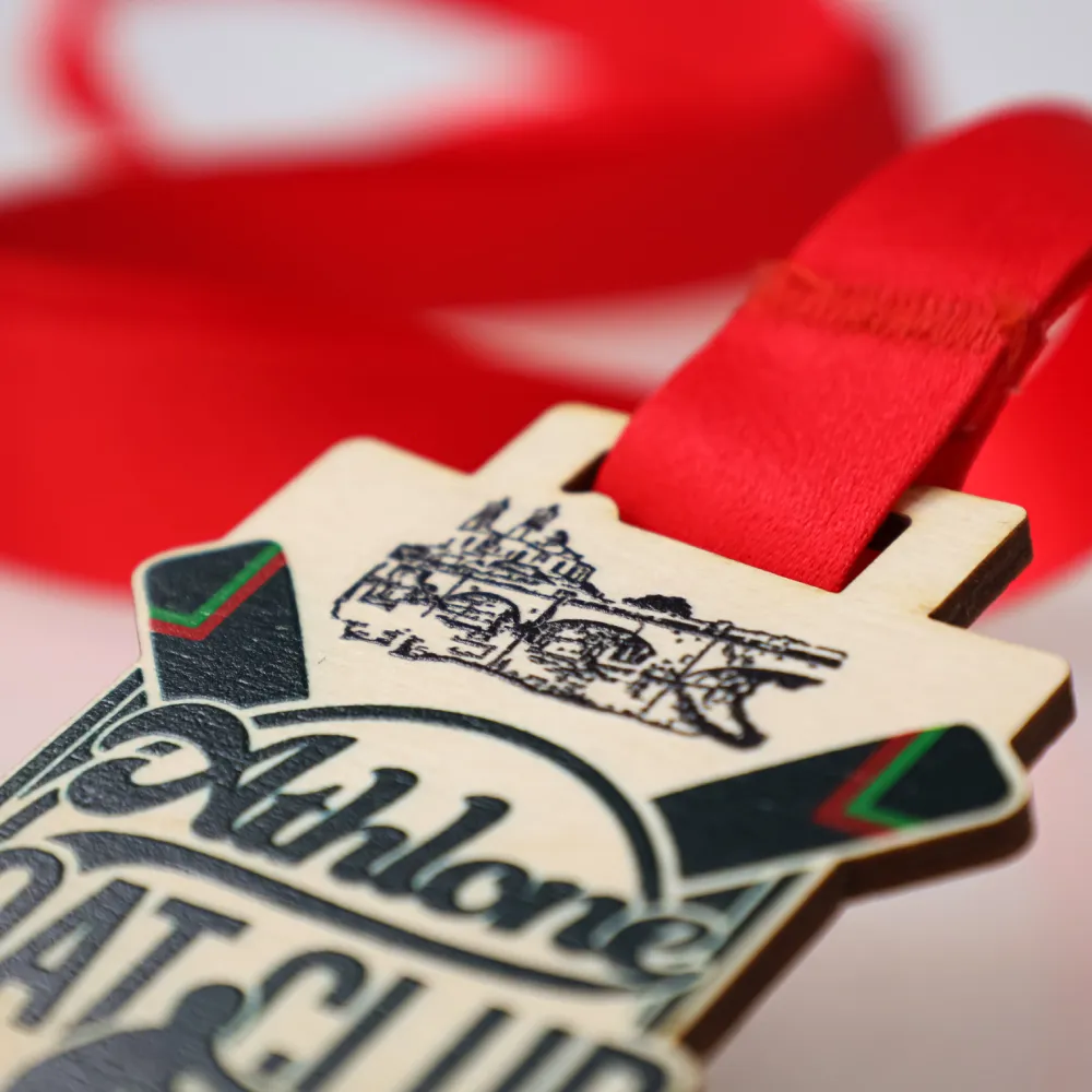 Una medalla original para el Athlone Boat Club 2025, donde la precisión artesanal va de la mano de la durabilidad. Cortada en forma de escudo en contrachapado natural, llama la atención de inmediato. Gracias a la moderna impresión UV, el panorama de la ciudad y los símbolos del remo son extraordinariamente nítidos, y su textura es perceptible al tacto. Estas medallas de madera no se desvanecerán y conservarán su aspecto impecable durante muchos años.