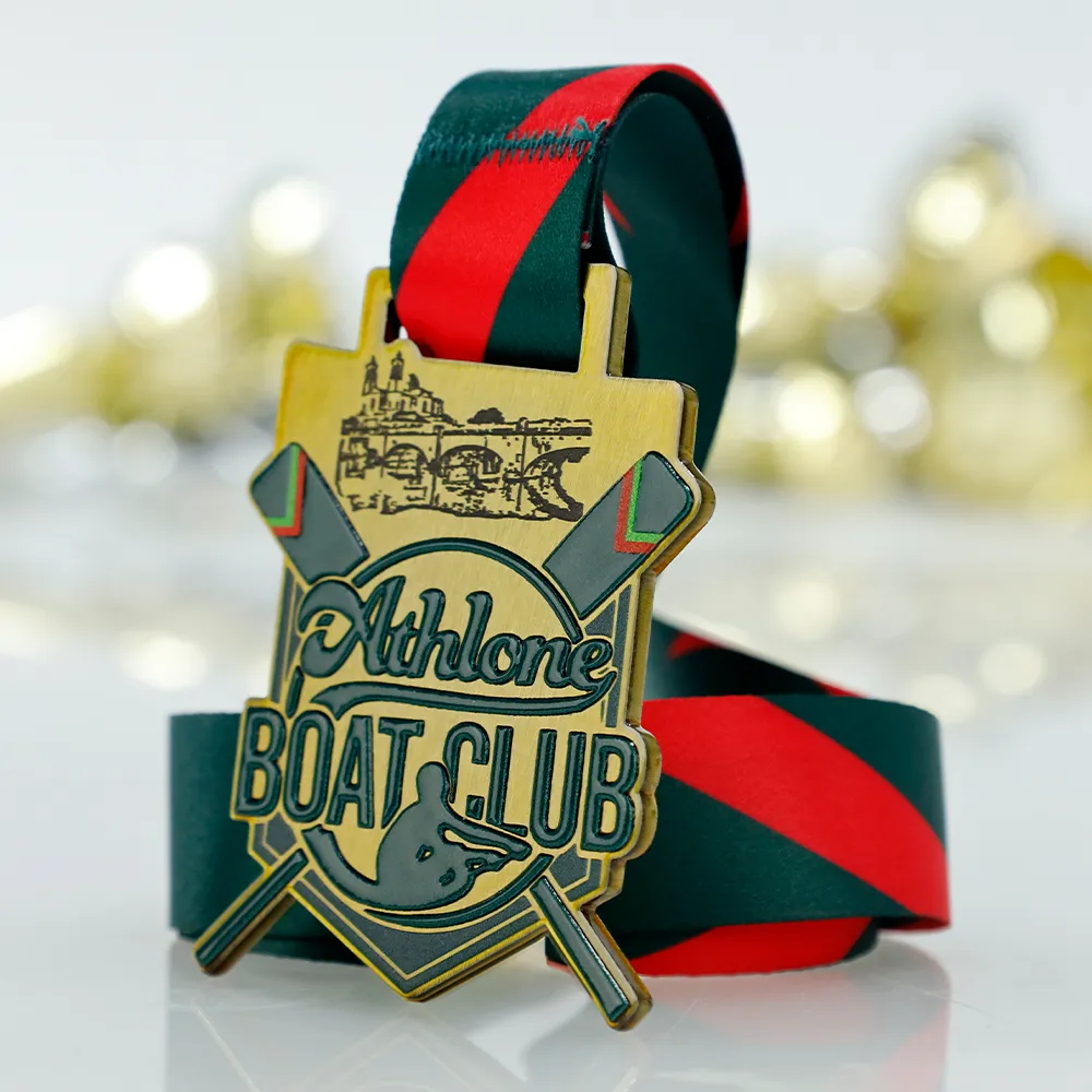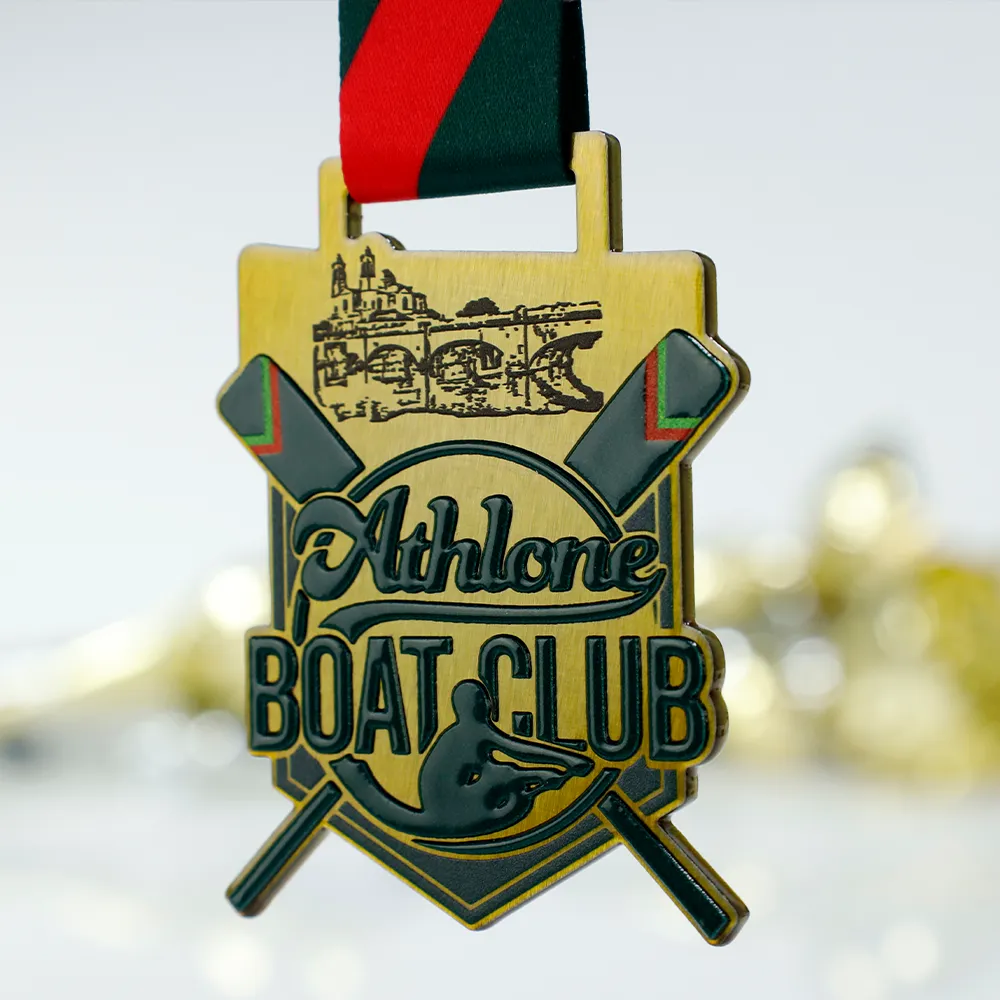 Esta medalla personalizada se diseñó para el Athlone Boat Club. Su contorno, cortado por láser, retoma la forma del escudo del club. El conjunto es dorado con detalles en esmalte verde oscuro, en consonancia con los colores del club. En el anverso, la impresión UV muestra un puente, remos cruzados y la figura de un remero.