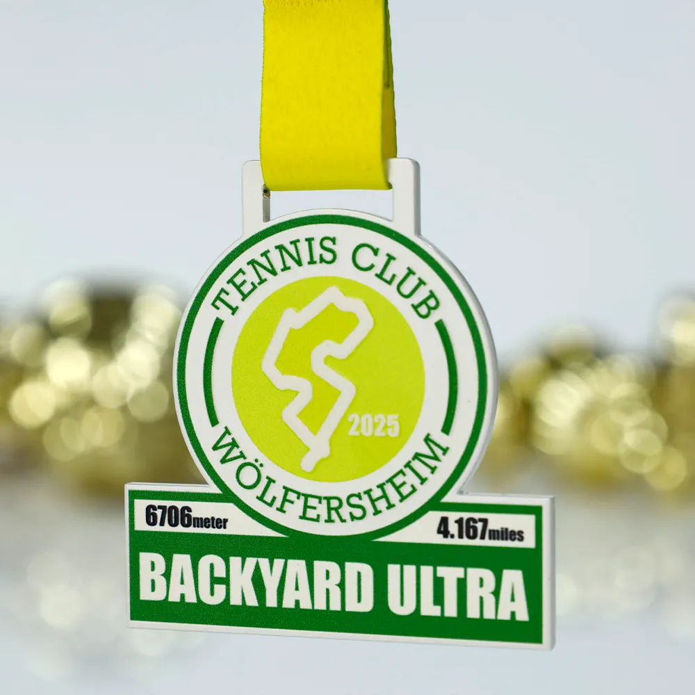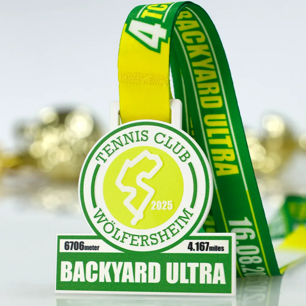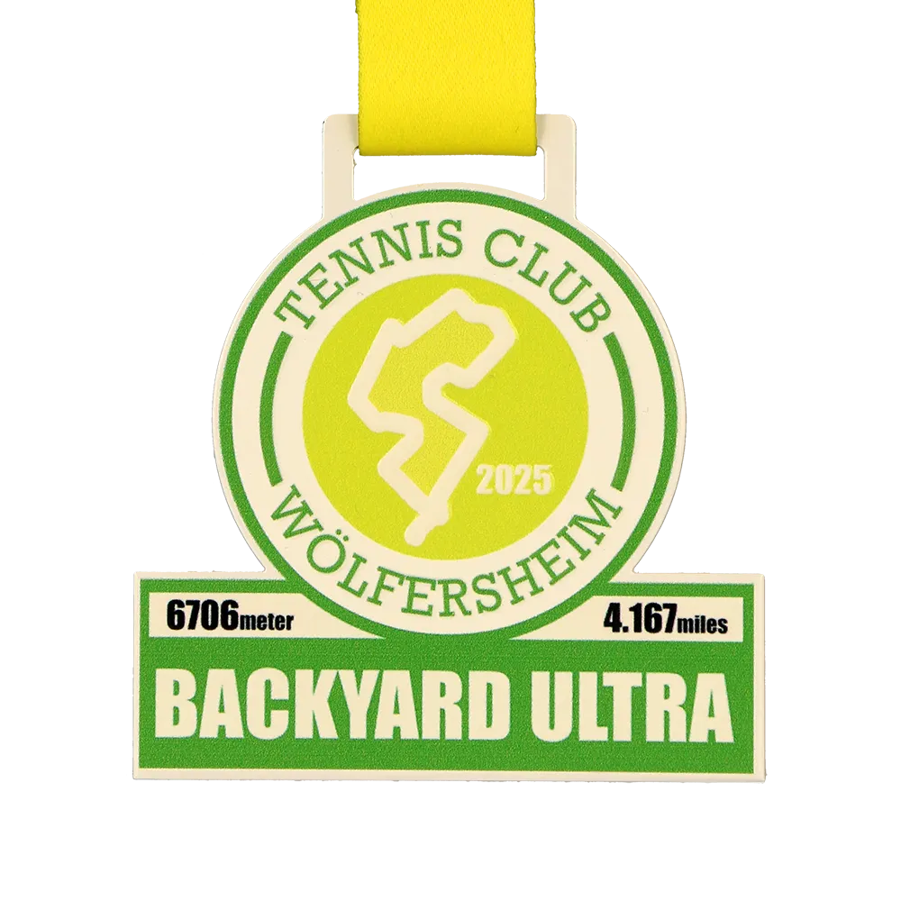 Medalla personalizada creada para los participantes de la carrera Backyard Ultra organizada por Tennis Club Wölfersheim en 2025. La medalla destaca por su combinación de colores verde y amarillo, un mapa del recorrido impreso y letras llamativas. Una medalla práctica para los aficionados al ultramaratón.