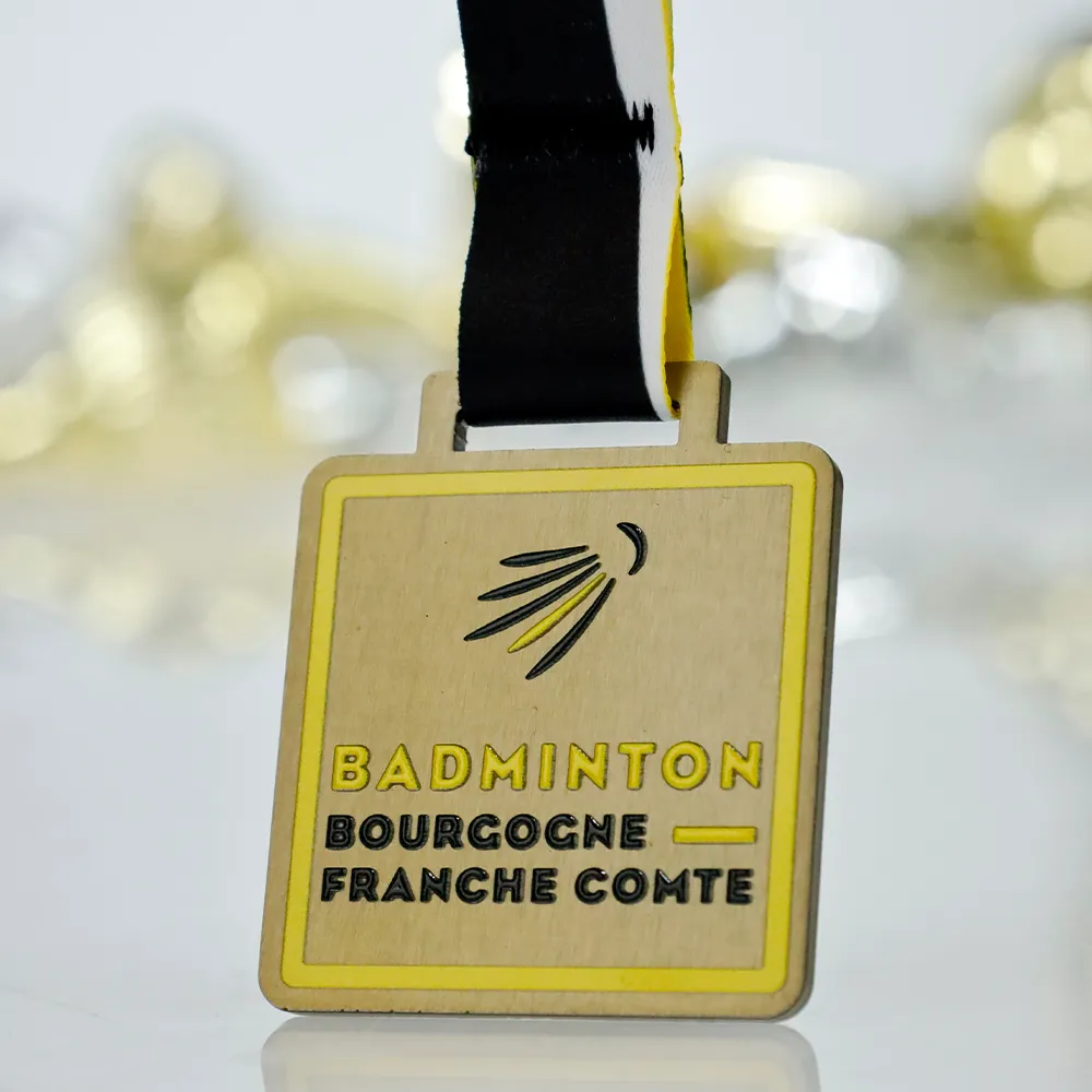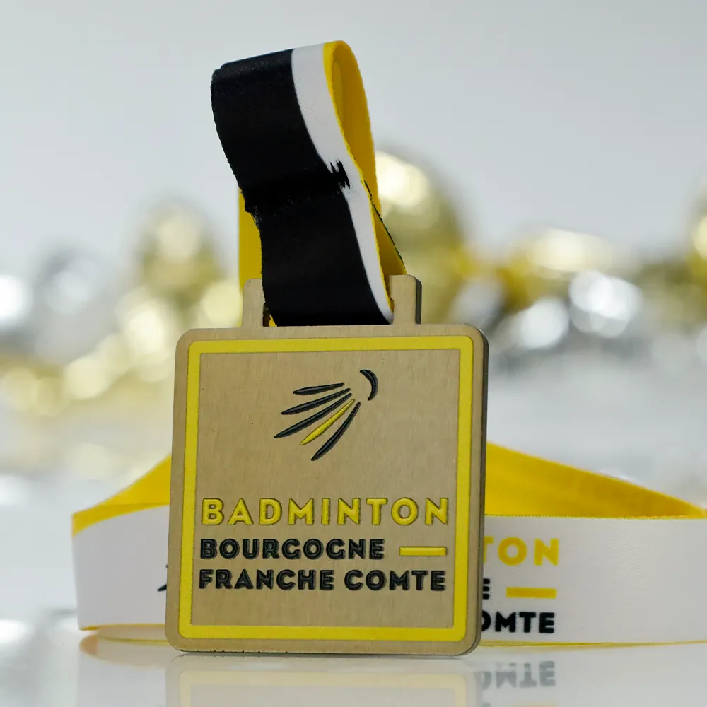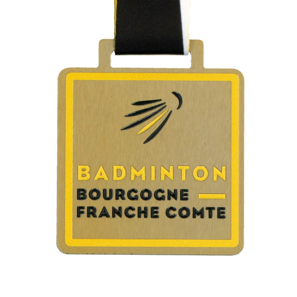 Una medalla personalizada fabricada en acero, cortada con láser y adornada con impresión UV a color con una textura en relieve que se puede sentir al tacto. El diseño sigue un estilo minimalista con un símbolo destacado de volante y el nombre de la región de Borgoña-Franco Condado. La medalla cuelga de una cinta en blanco y negro que combina con el diseño general. Un premio elegante y moderno para los participantes en torneos de bádminton.