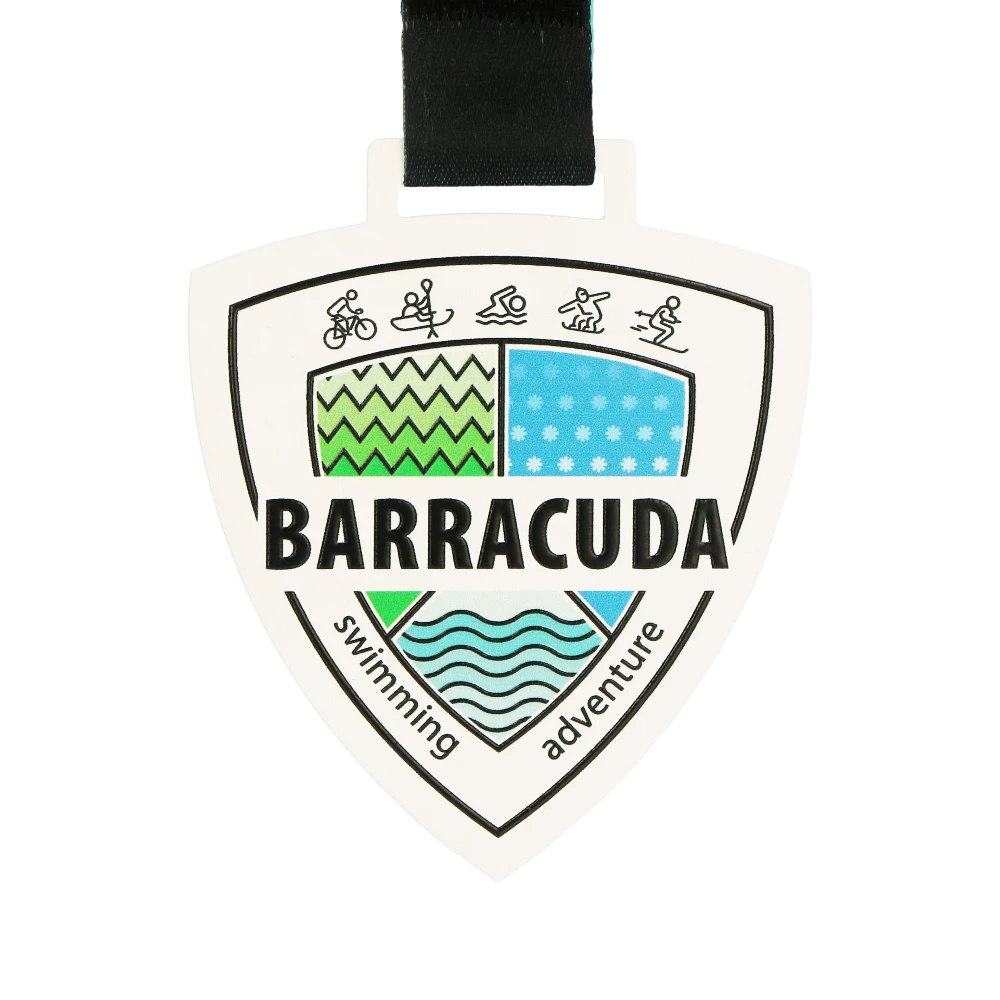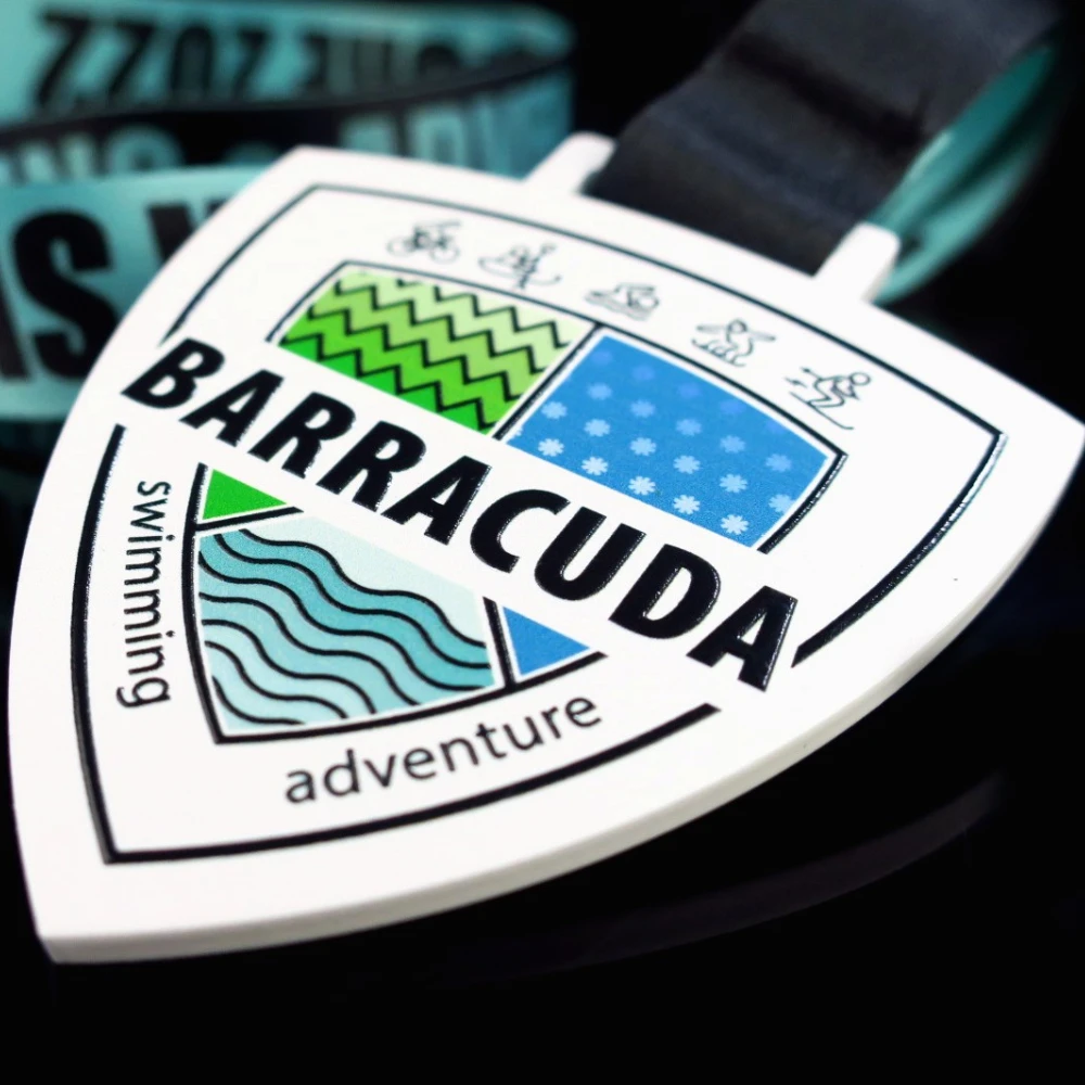 La natación es uno de esos deportes en los que el esfuerzo individual del atleta es decisivo. Solo quienes están dispuestos a dedicar mucho tiempo logran grandes éxitos. Para reconocer este esfuerzo, creamos increíbles medallas para competiciones de natación. Una de ellas es la medalla diseñada para la competición Barracuda. Esta medalla de acero destaca por su forma triangular con bordes suavemente redondeados. Su color blanco ofrece un fondo perfecto para la llamativa impresión a color. Además, en el centro de la medalla figura el nombre de la competición en negrita, para recordar a los atletas su participación.