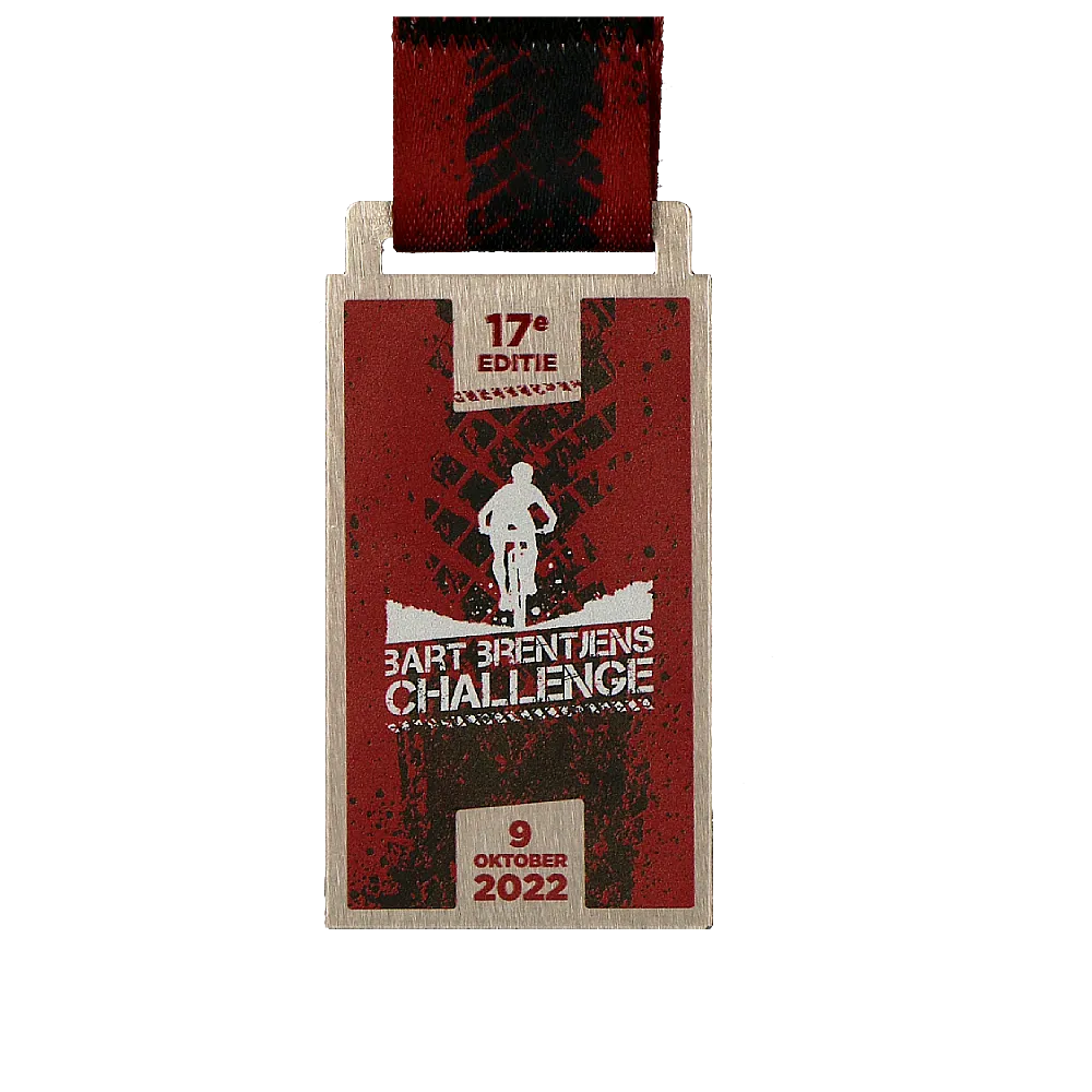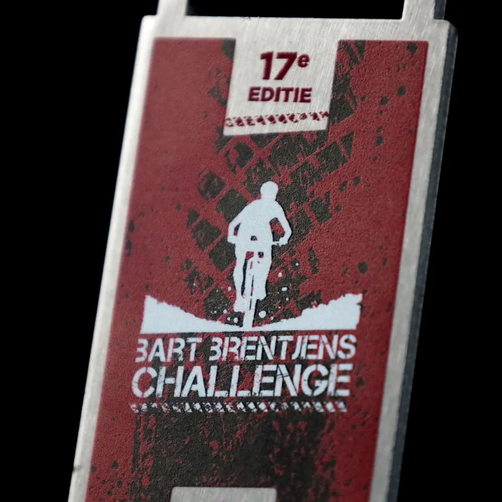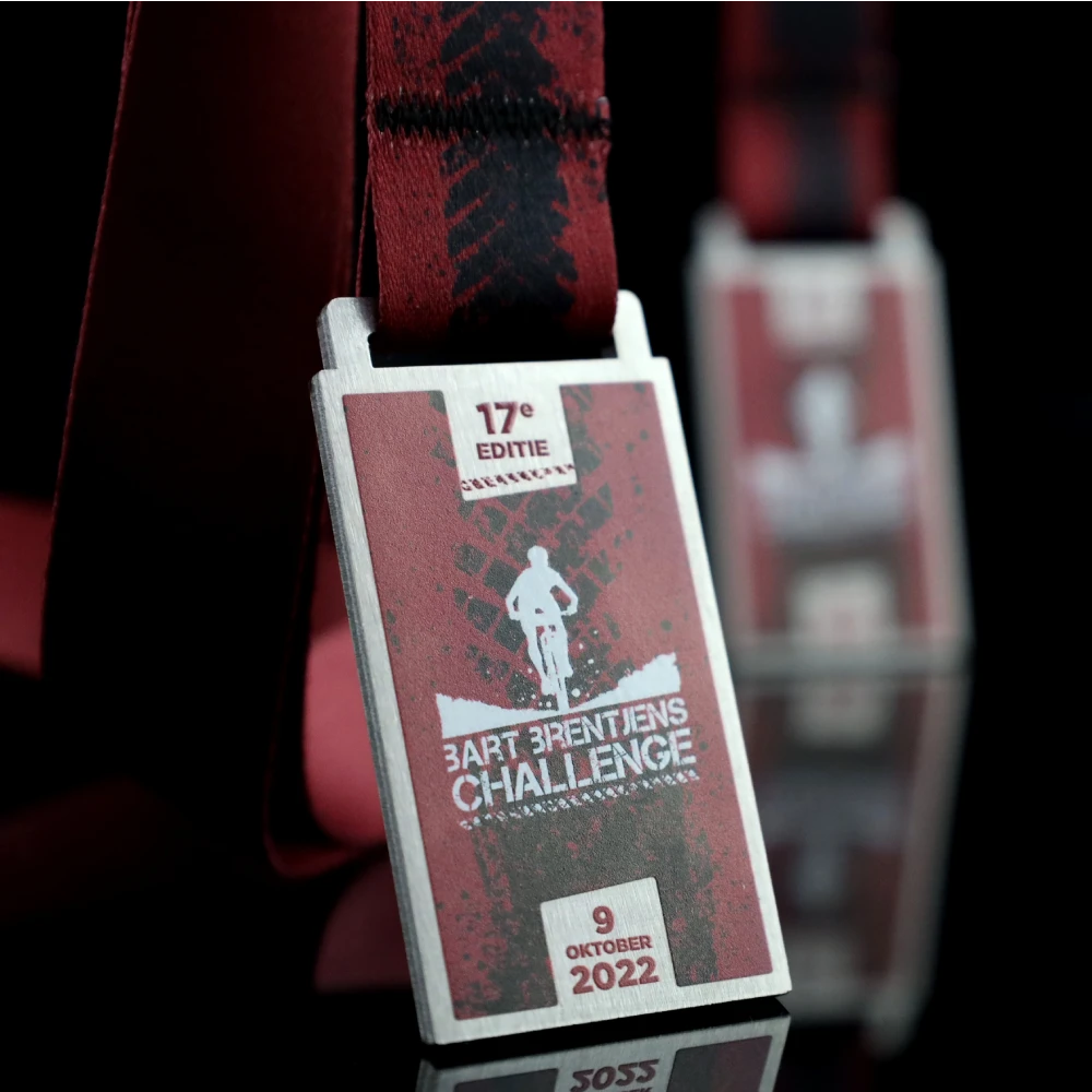 Cada competición de ciclismo termina en la línea de meta, donde los participantes reciben medallas conmemorativas. Este es el broche final a su esfuerzo. Para el Bart Brentjens Challenge, preparamos medallas de acero originales en una forma clásica. Gracias a ello, pudimos mostrar de forma estética las decoraciones tridimensionales aplicadas con una impresión a color. Las medallas plateadas de ciclismo también se distinguen por unos gráficos perfectamente adaptados que hacen referencia a las carreras de bicicleta. En la superficie de la medalla imprimimos decoraciones que representan a un ciclista y la marca de un neumático. Todo se completa con una cinta personalizada en un color a juego.