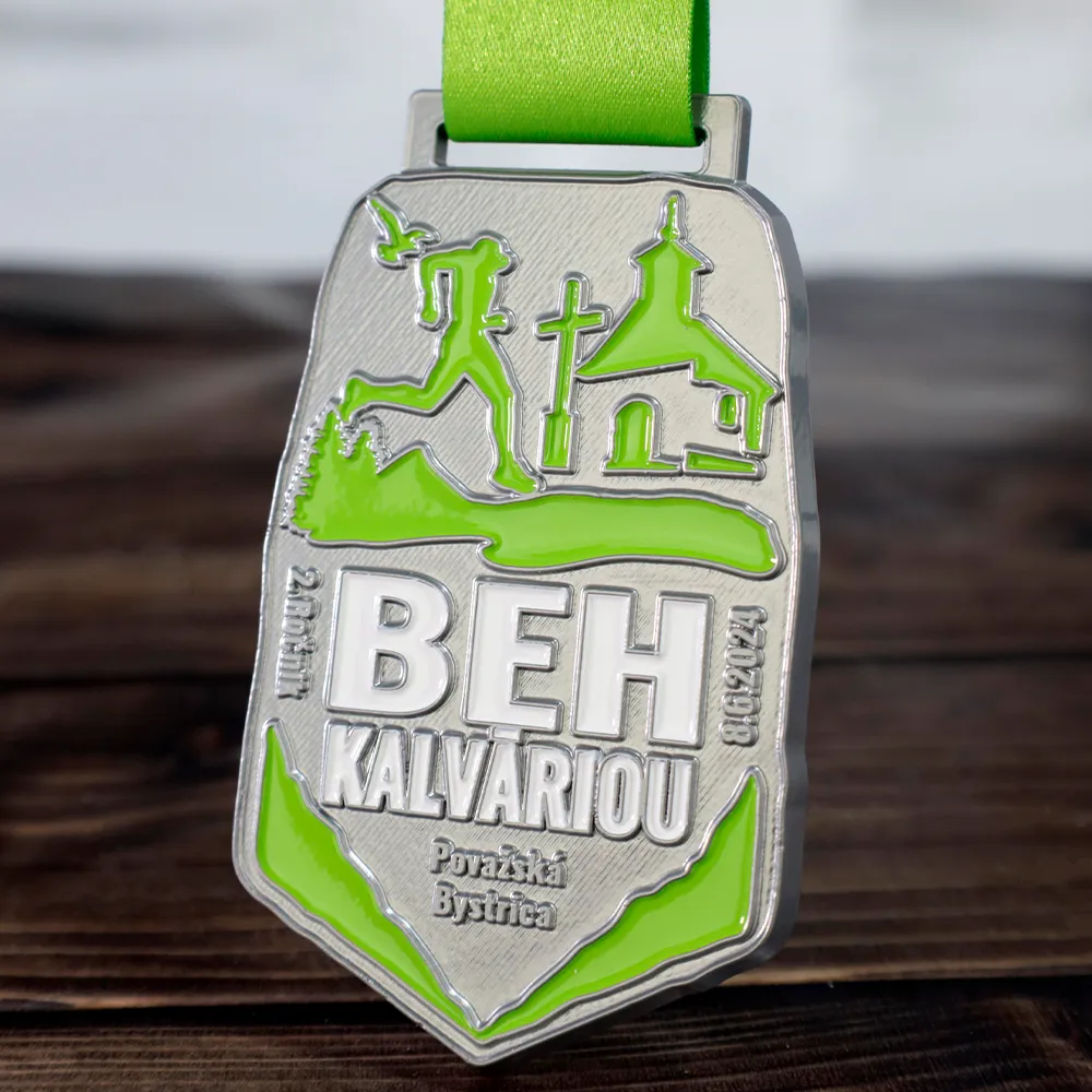 La medalla personalizada de carrera para los participantes del Beh Kalváriou 2024 es un hermoso recuerdo de este evento de montaña. Presenta la figura de un corredor con el Calvario al fondo, con una cruz y una capilla visibles, reflejando perfectamente el carácter del recorrido. Es una medalla fundida, lo que permite una forma única y gran detalle. Los elementos en color fueron rellenados con pintura, dándole un aspecto distintivo y resaltando la simbología de la carrera.