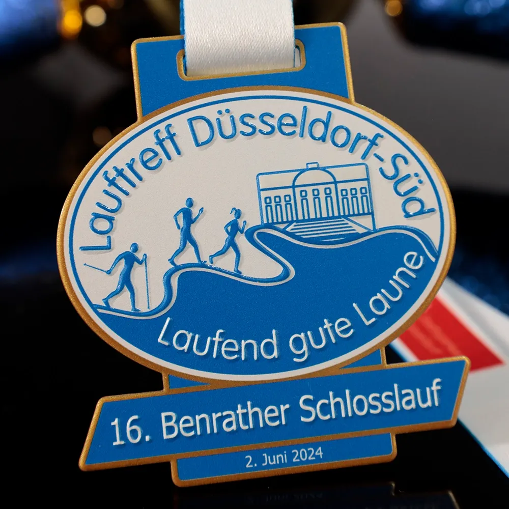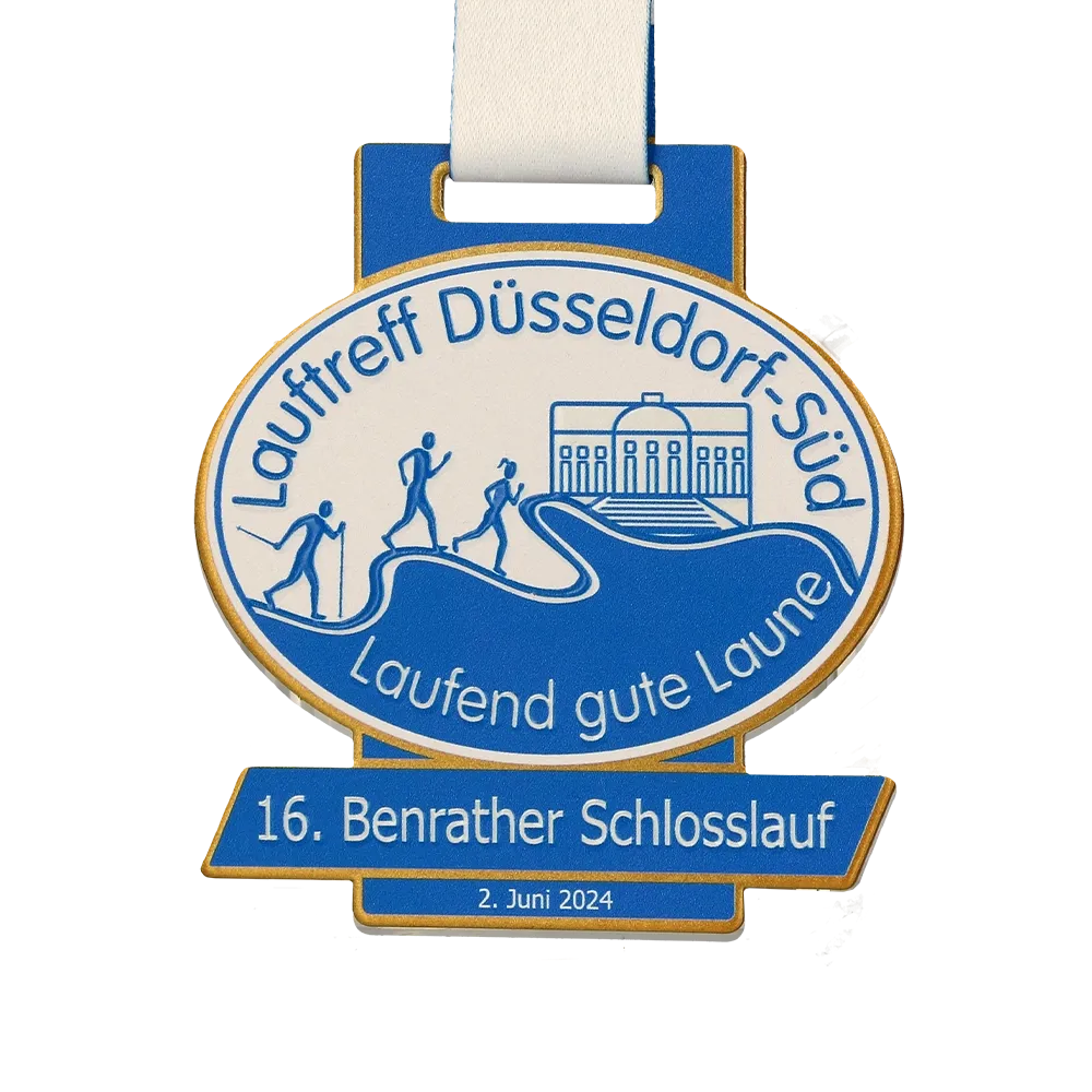 Una medalla personalizada de carrera creada para el Benrather Schlosslauf. Tiene forma ovalada con elementos rectangulares adicionales en la parte superior e inferior. Esta forma le da un aspecto moderno que la hace destacar entre otras medallas. Sobre el fondo blanco de la medalla imprimimos la imagen de tres corredores mediante impresión UV.