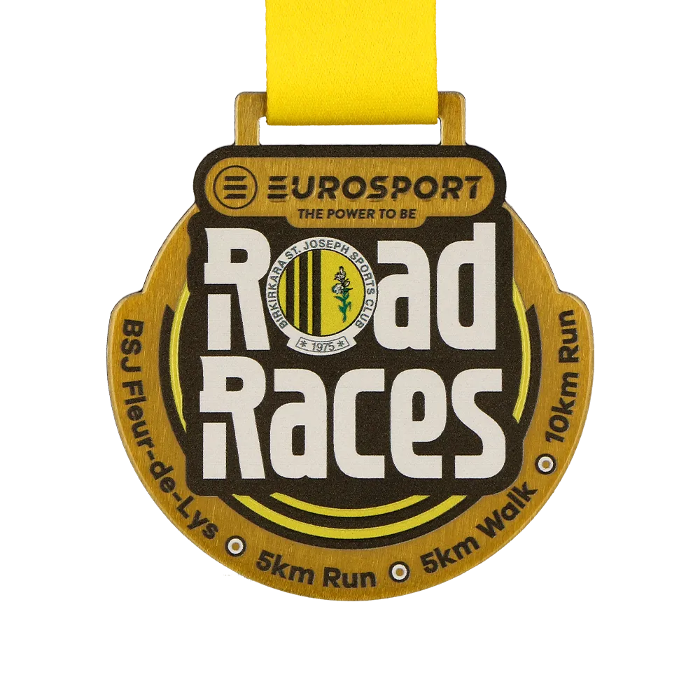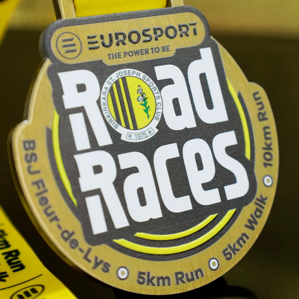 Una medalla personalizada de carrera diseñada para el Birkirkara St. Joseph Sports Club. Una medalla dorada con el nombre del evento y las distancias impresos en UV de colores.