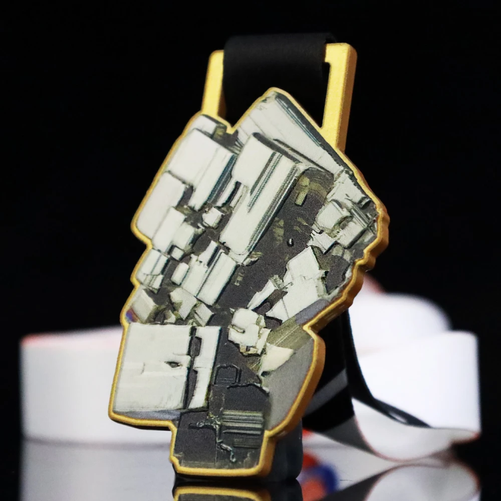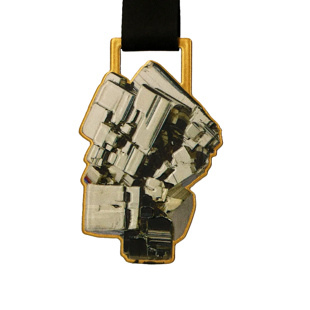 Medallas modernas de acero con una forma única cortada a láser. Se distinguen por una impresión a color aplicada con precisión en ambos lados de la medalla.