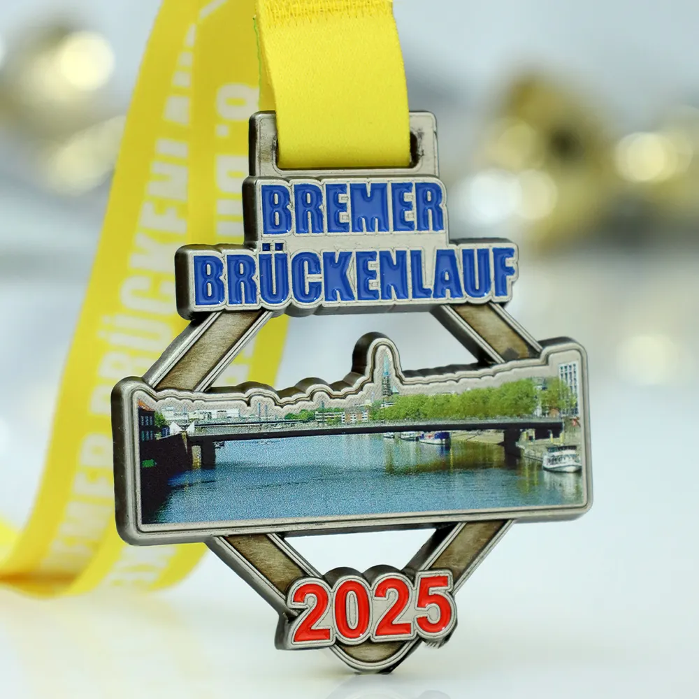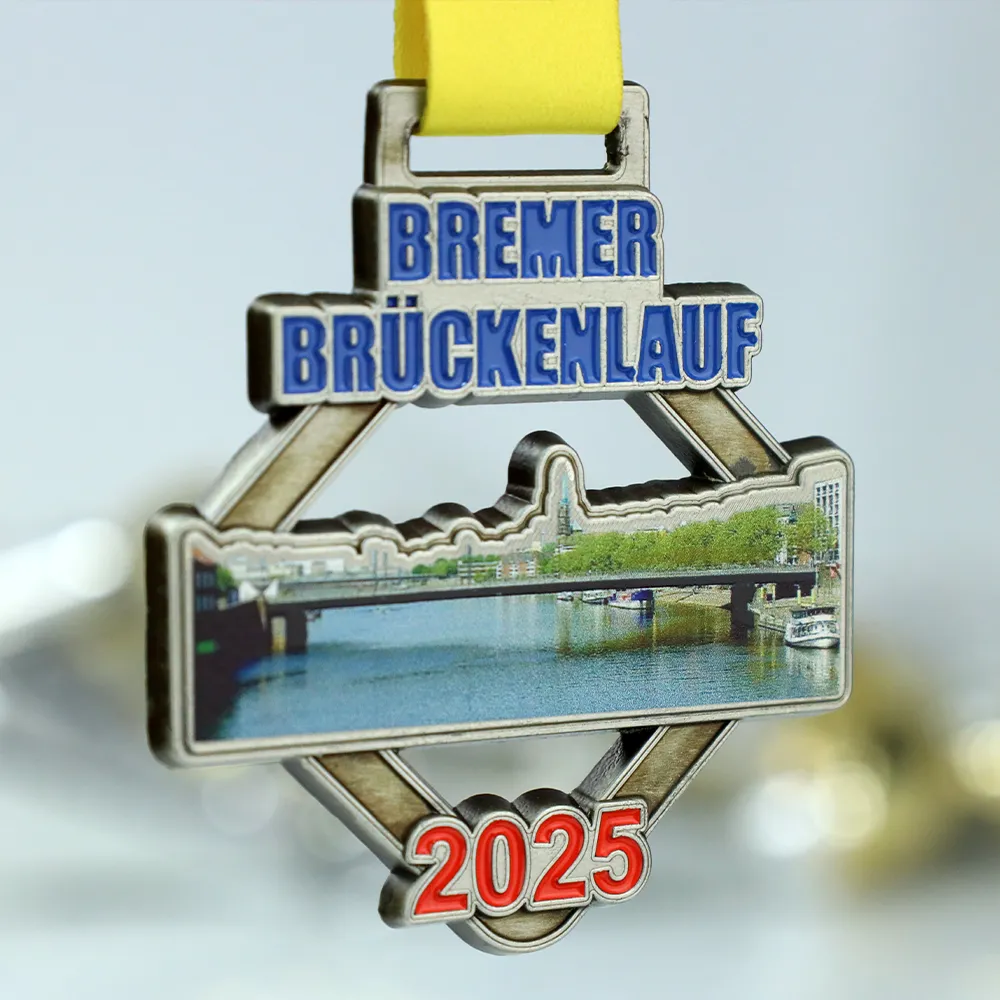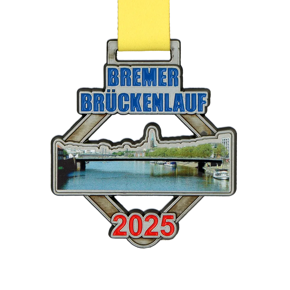 Hemos creado una medalla personalizada para el Bremer Brückenlauf 2025. La medalla ha sido realizada mediante el método de fundición y decorada con detalles esmaltados e impresión UV a todo color. El motivo central es una foto realista de un puente sobre el río, encajada en el molde de metal, con el nombre del evento y el año 2025 visibles. Prepararemos una medalla similar para tu evento.