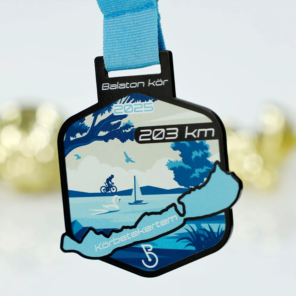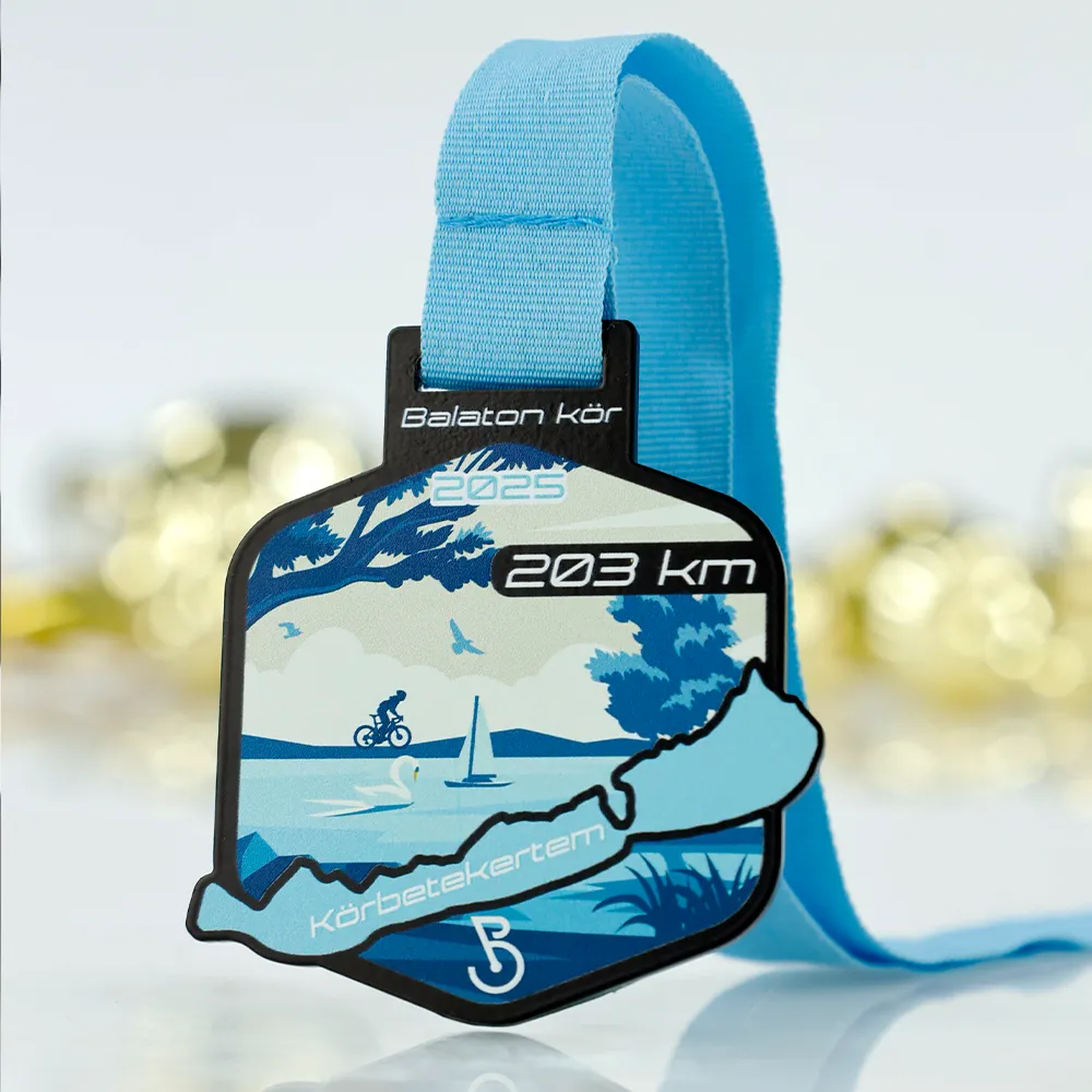 Medalla deportiva personalizada creada para la ruta ciclista Balaton Kör 2025. En el anverso aparece el paisaje del lago Balaton con un ciclista, un yate y un cisne, producidos con impresión UV duradera.