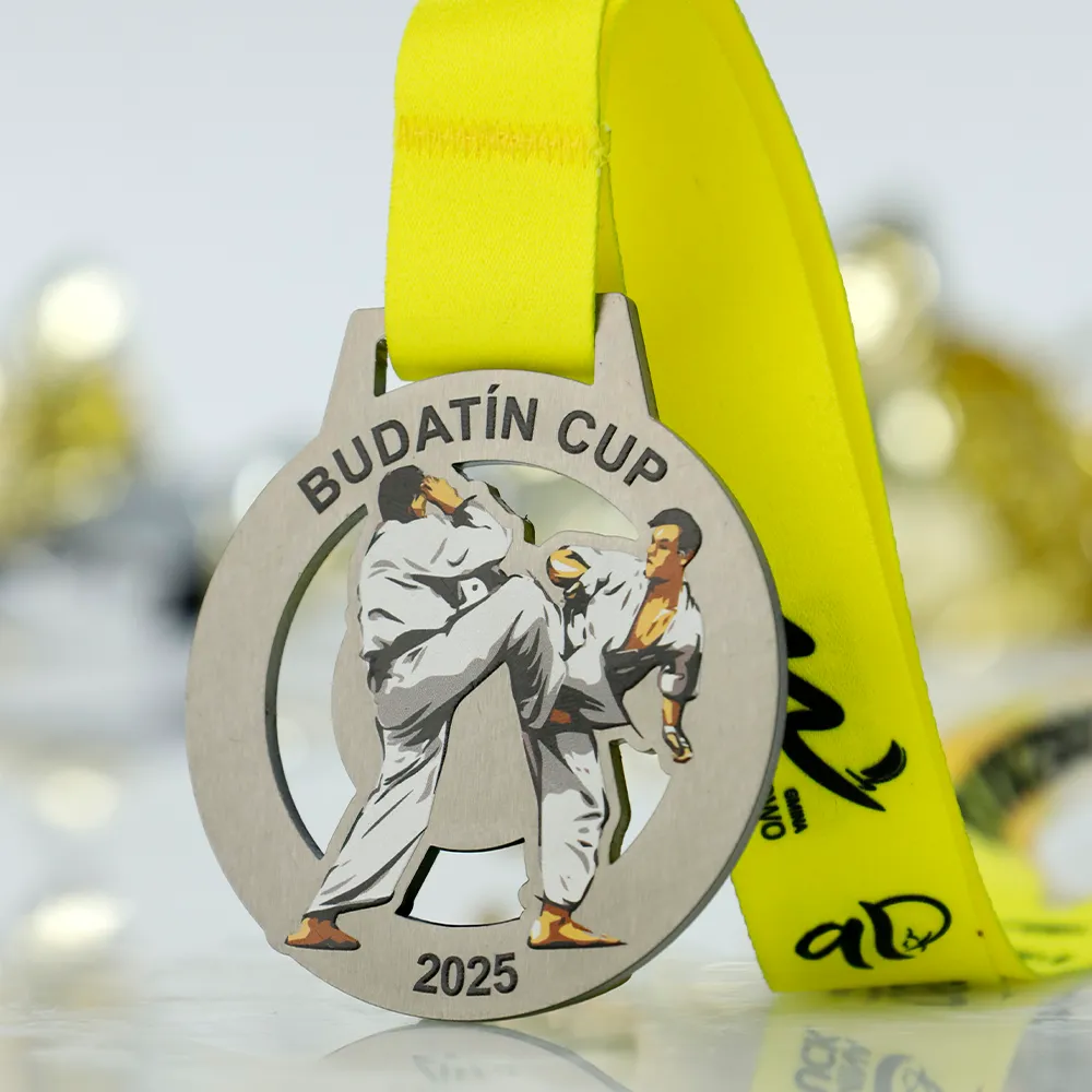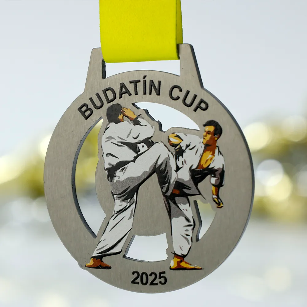 Medalla personalizada de acero con impresión UV a color que muestra a dos luchadores de kárate en combate. La medalla tiene forma circular con un recorte interior. En la superficie figura el nombre Budatín Cup y el año 2025. Destinada como premio para participantes de competiciones de artes marciales.