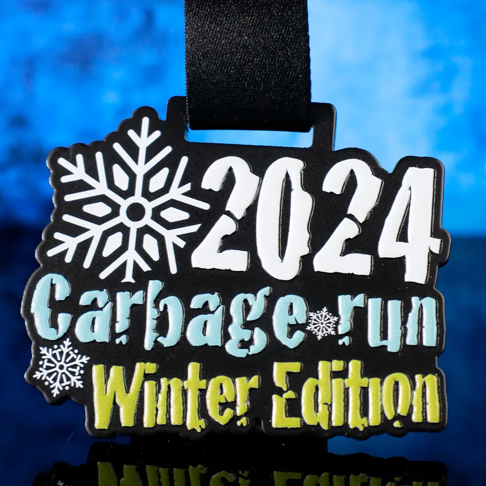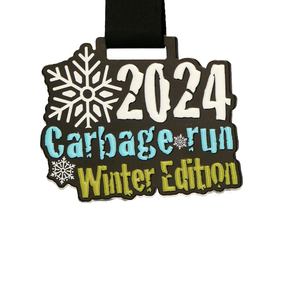 Una medalla personalizada de carrera creada para la Carbage Run Winter Edition. Es una medalla negra con formas únicas y el nombre del evento impreso junto a un motivo invernal que refleja el carácter de la carrera.