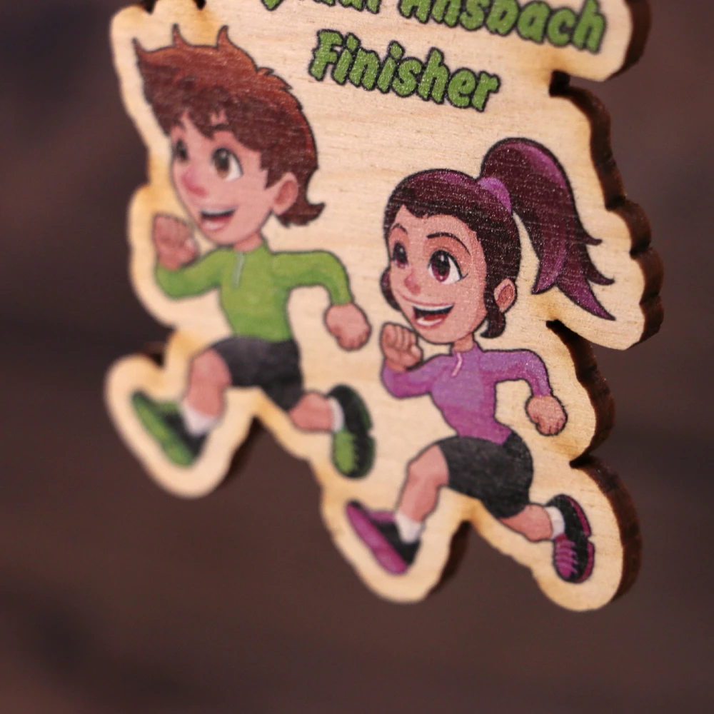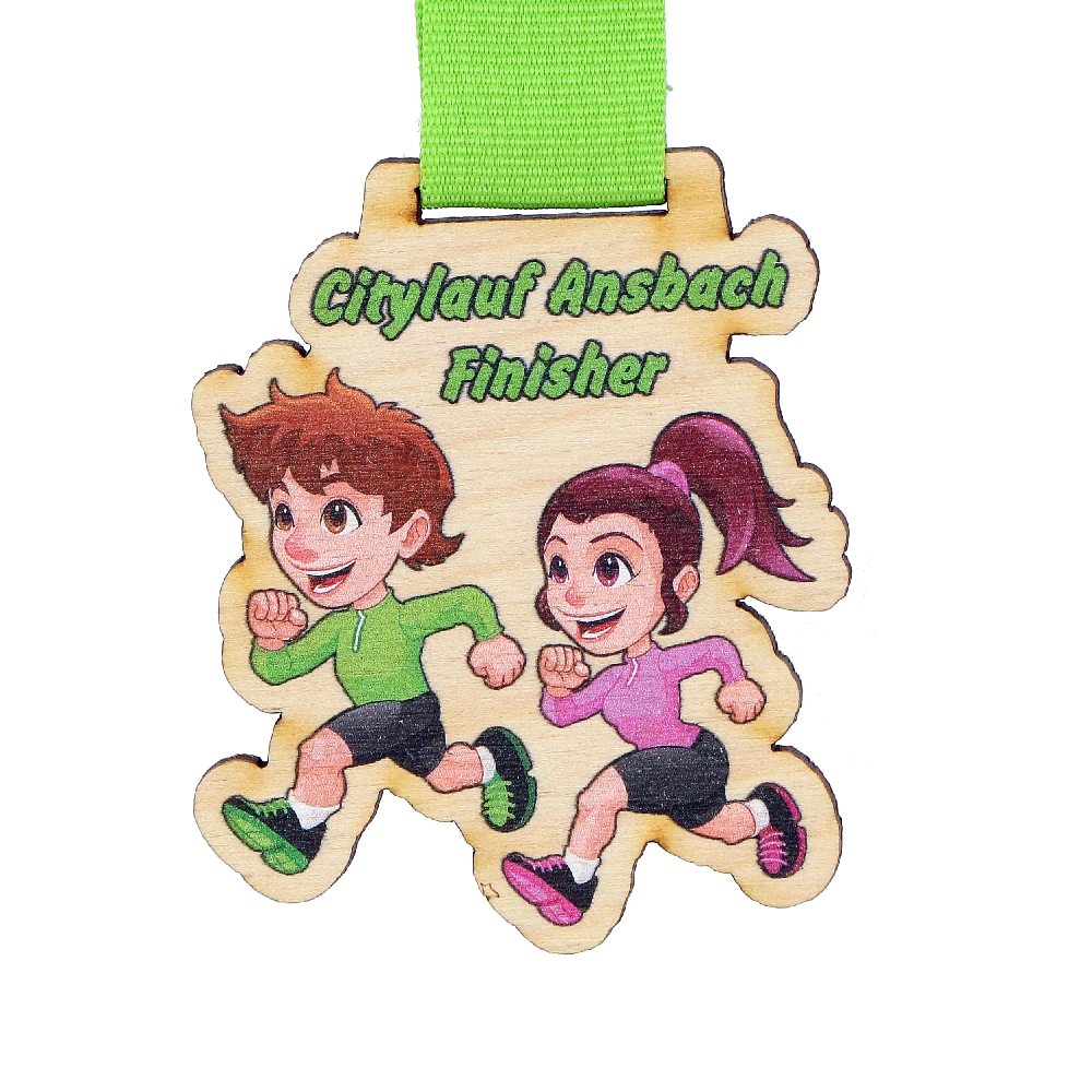 El deporte une a las generaciones, especialmente en las competiciones de carreras en las que puede participar toda la familia. El City Run Ansbach es, sin duda, uno de estos eventos, celebrado con medallas de madera producidas por nuestra empresa. Creamos estas medallas en dos versiones: un diseño elegante para los participantes adultos y otro colorido para los corredores más jóvenes.