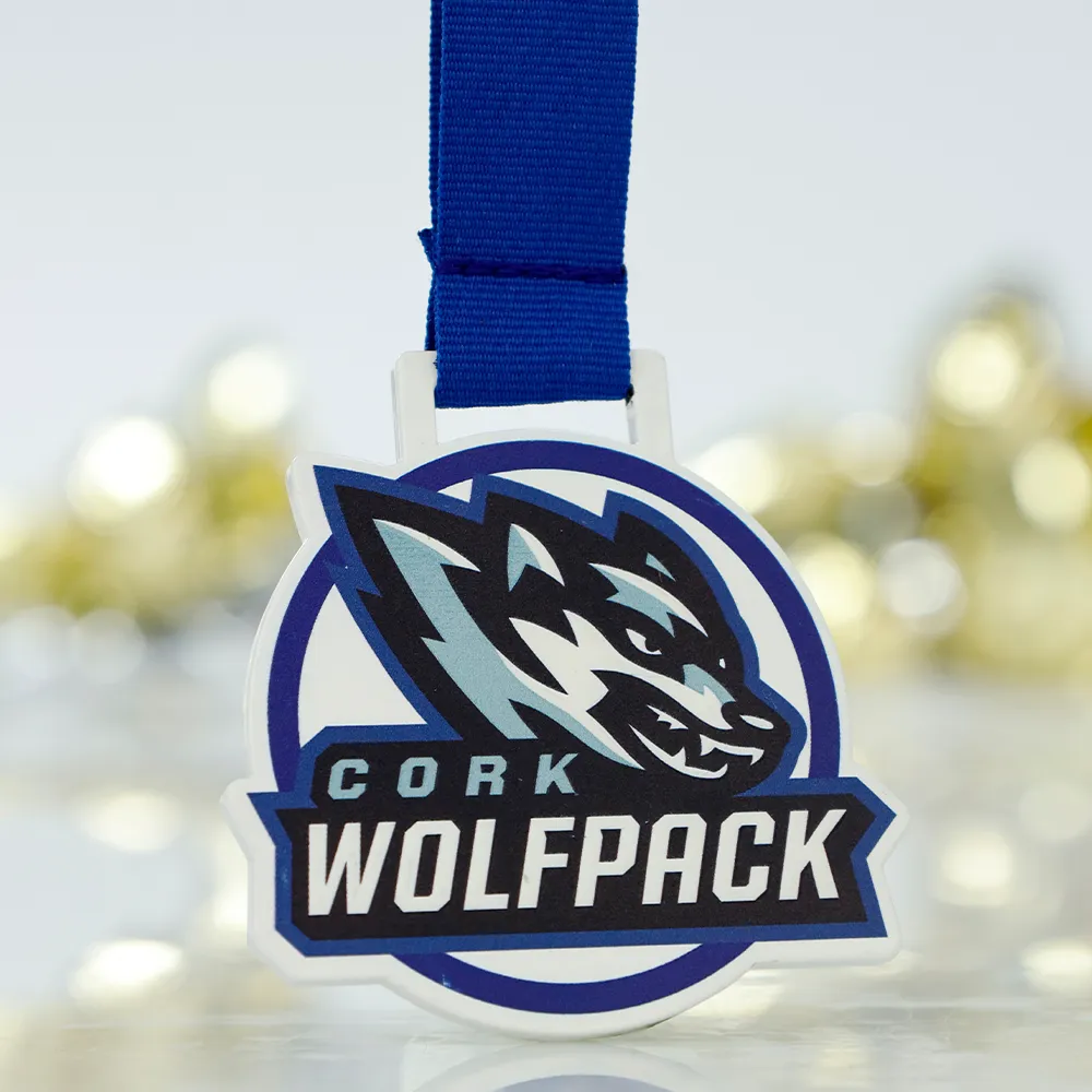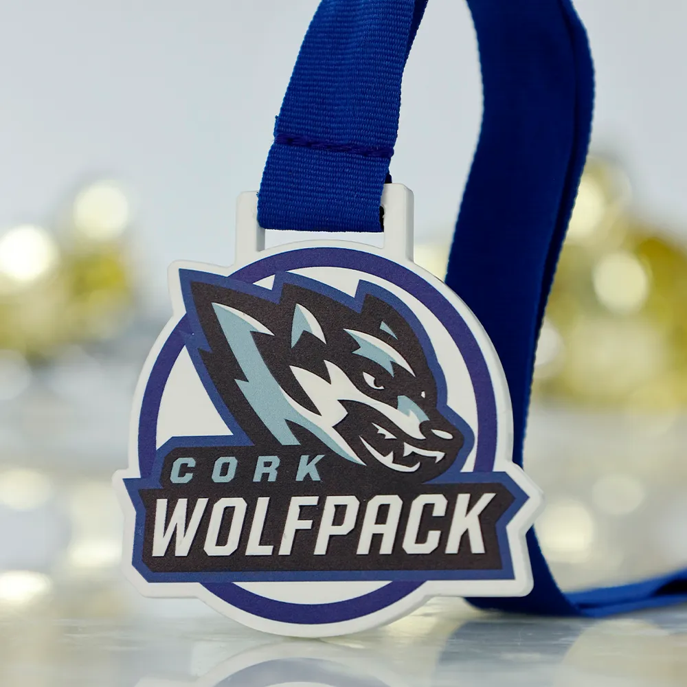 Medalla personalizada de acero con impresión UV a todo color que muestra el logotipo de Cork Wolfpack. Tiene una forma dinámica adaptada al diseño y está en tonos azul, negro y blanco. La personalización incluye el nombre del equipo y un signo gráfico individual.