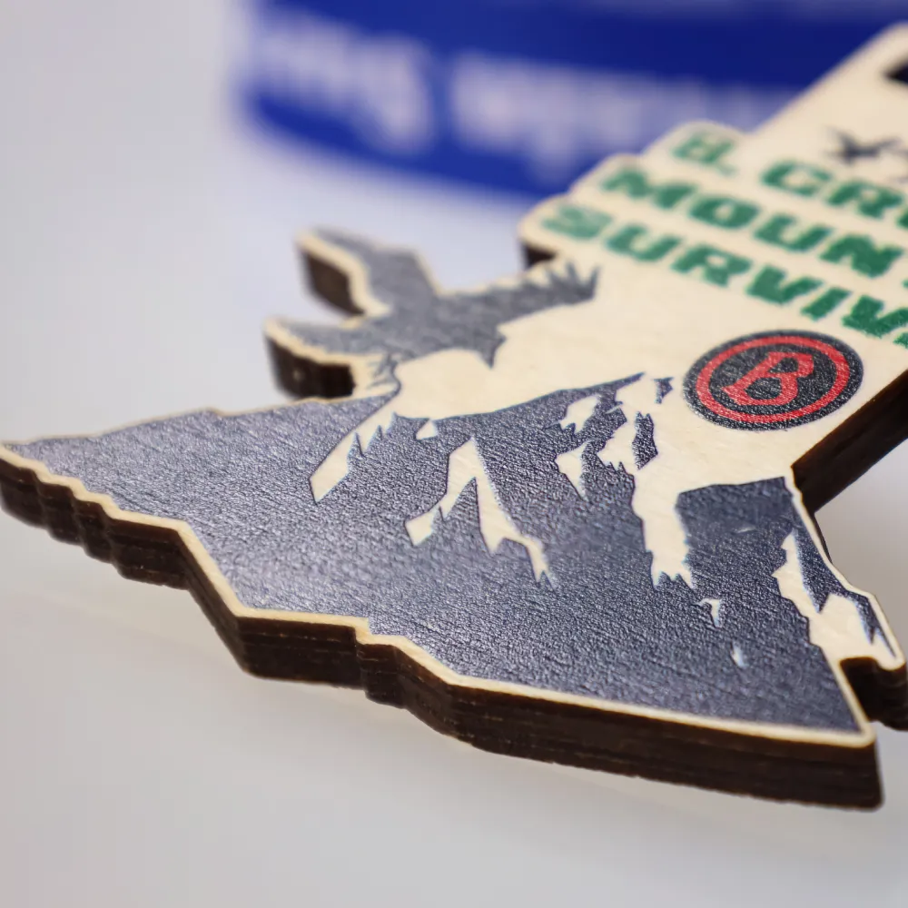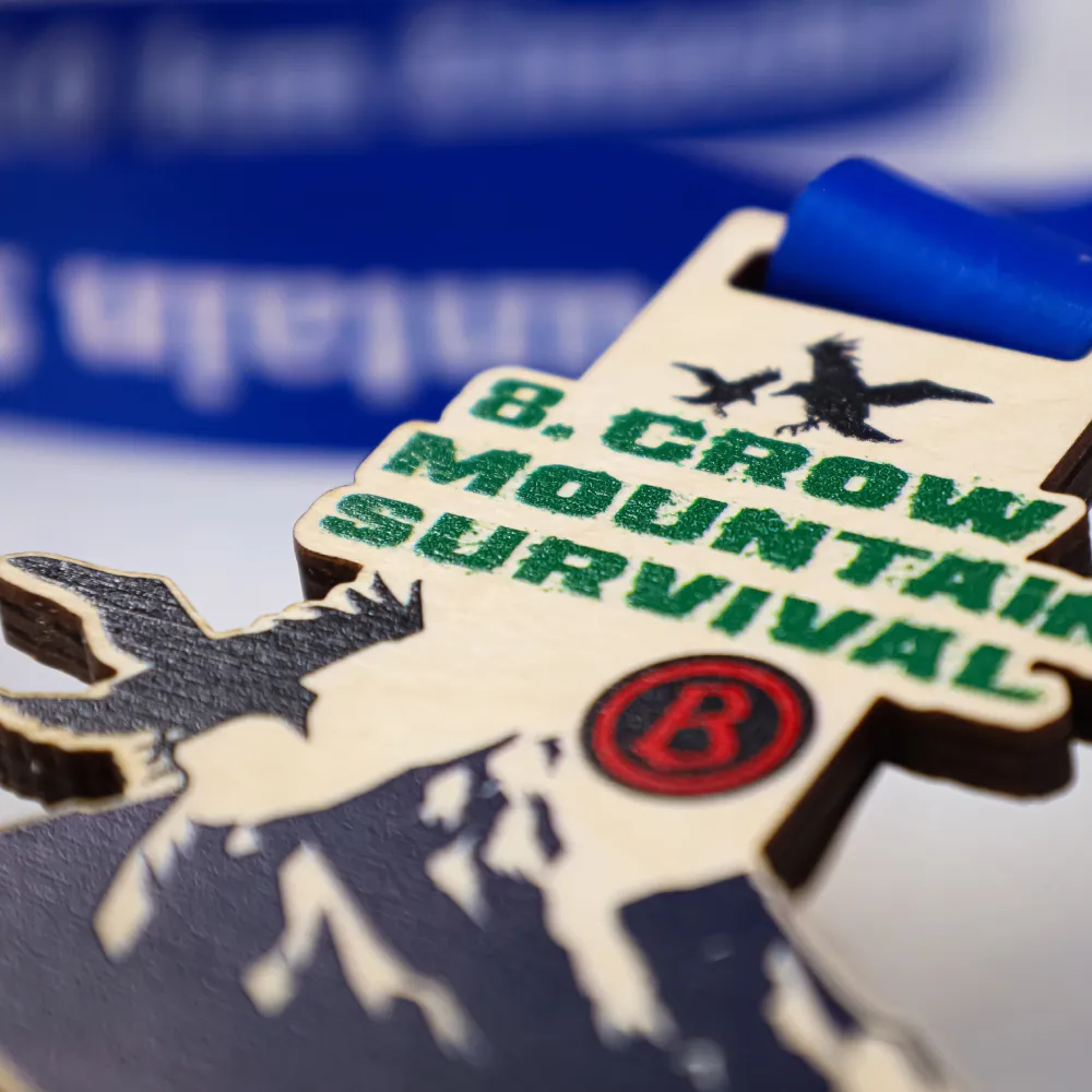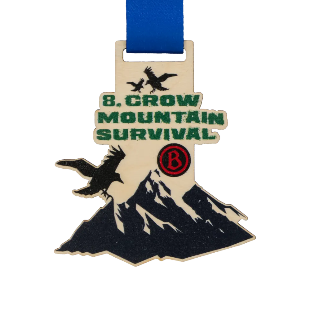 La medalla de madera diseñada para el 8.º Crow Mountain Survival ha sido fabricada en contrachapado de alta calidad. La aplicación de la técnica de impresión UV confiere a los elementos gráficos, como la montaña y las siluetas de aves, una estructura viva y perceptible al tacto. Estas medallas de madera se caracterizan por una forma original que reproduce fielmente la línea de las cumbres montañosas.