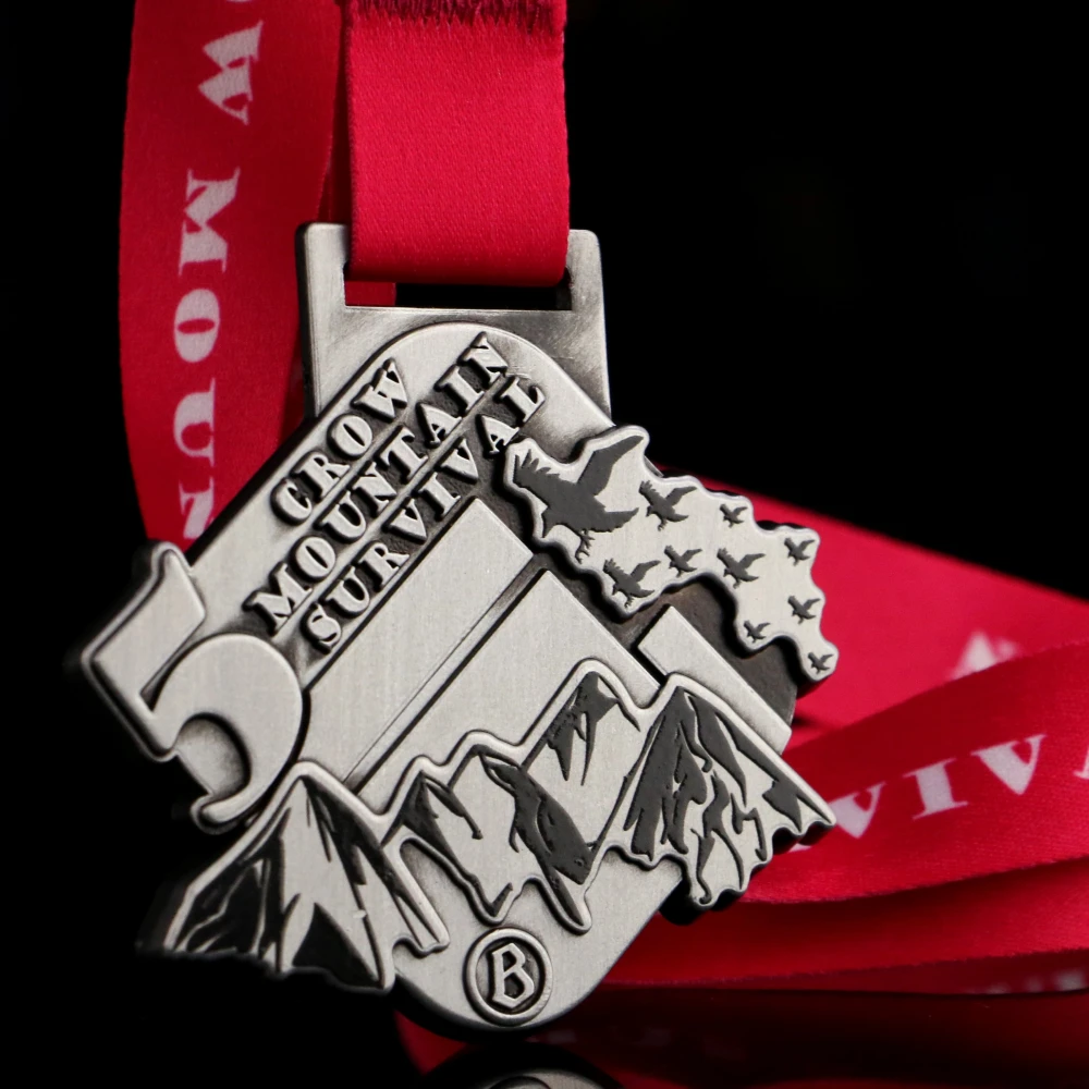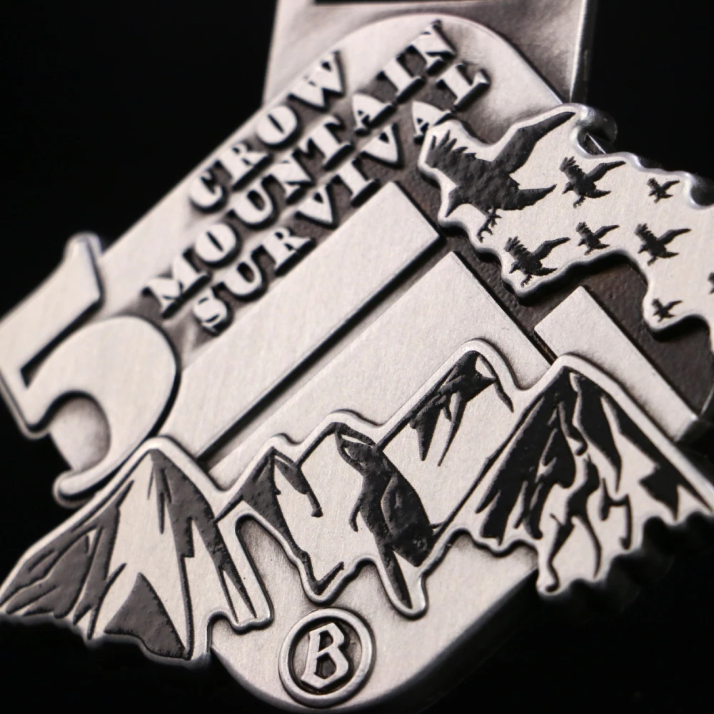 Una medalla puede ser interesante por muchas razones. Entre ellas se encuentran el material, la calidad, el tamaño, la forma o el tipo de decoración. La personalización de cada uno de estos elementos es posible gracias a un diseño individual para nuestros clientes. Así lo aprovechó el organizador de una increíble carrera de obstáculos llamada Crow Mountain Survival. En Winmed preparamos medallas fundidas únicas y extremadamente duraderas para esta ocasión. Tienen una forma poco común y se distinguen por decoraciones tridimensionales que cubren toda la superficie del premio. Los relieves que se sienten bajo los dedos fueron cubiertos además con una elegante impresión negra que combina perfectamente con el fondo plateado. Todo el conjunto se completa con una cinta de sublimación perfectamente a juego.