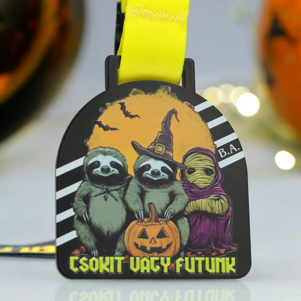 Una medalla personalizada diseñada dla la carrera de Halloween 'Csokit Vagy Futunk'. Presenta un diseño humorístico con tres perezosos disfrazados de Halloween, una calabaza y murciélagos sobre una luna naranja. La medalla cuelga de una cinta amarilla, creando un aspecto temático y coherente.