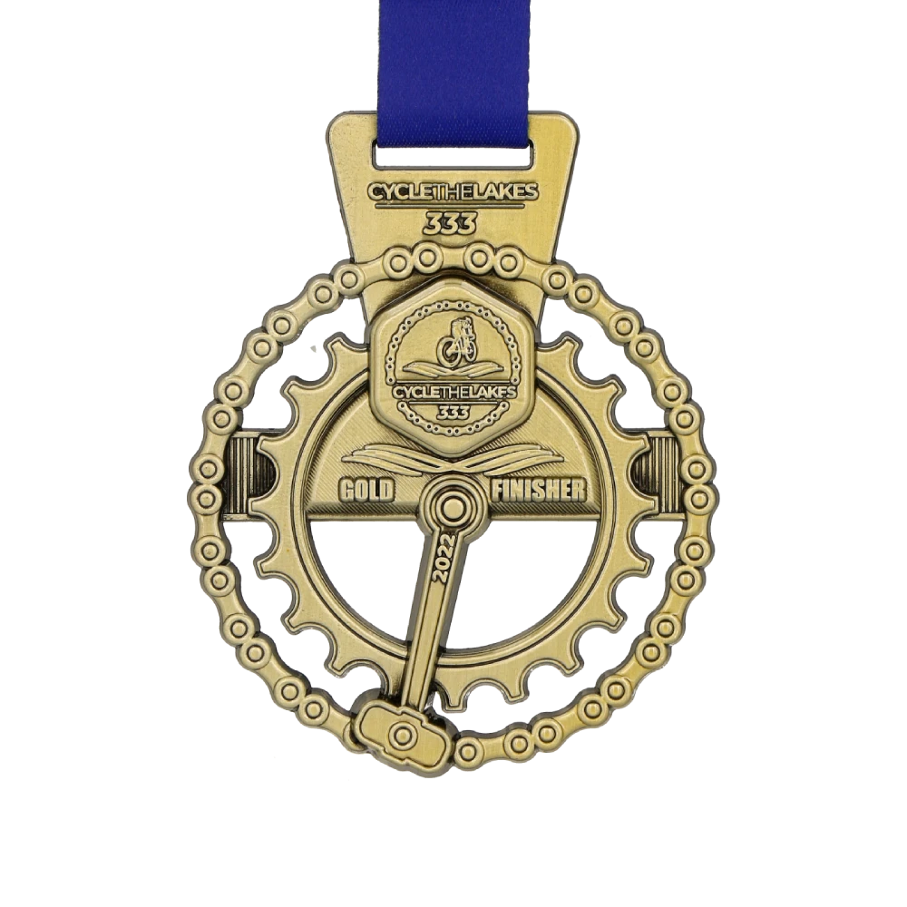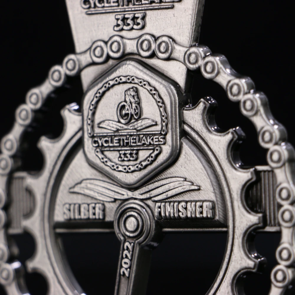 Cada evento deportivo requiere que el fabricante de medallas adopte un enfoque individual. Así, los atletas reciben grandes premios que les recordarán su participación durante años. Nuestra medalla para Cycle The Lake evocará, sin duda, gratos recuerdos. Esta medalla de fundición se distingue por su forma inspirada en un piñón de rueda de bicicleta. De esta forma, refleja perfectamente la atmósfera de una competición ciclista. Además, presenta numerosas decoraciones en su superficie. El cuidado y la atención al detalle nos permitieron reproducir el diseño a la perfección, logrando que estas medallas personalizadas cumplieran totalmente las expectativas de nuestro cliente.