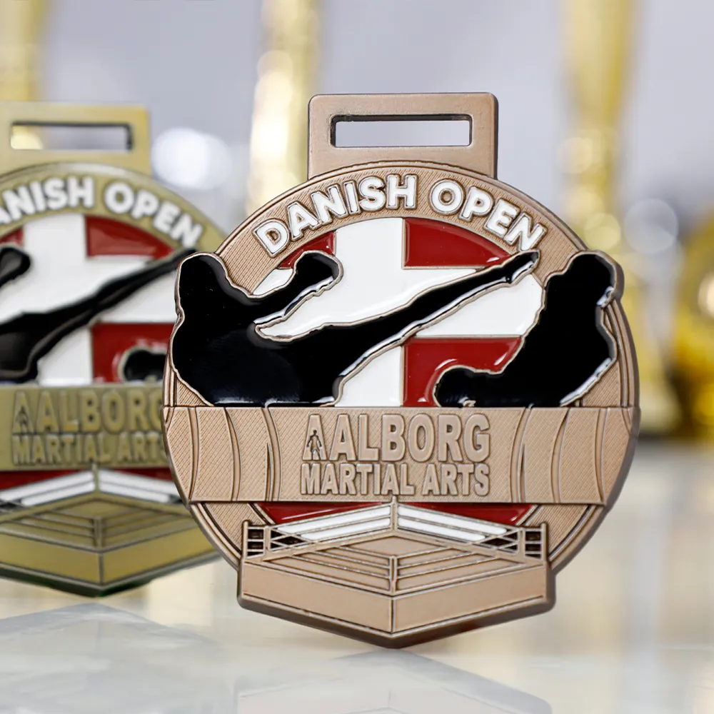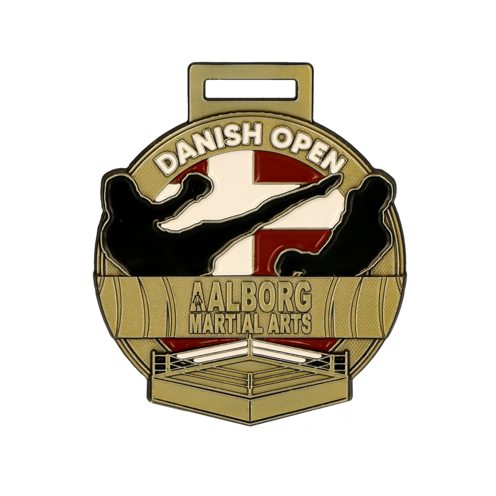 Unas medallas personalizadas diseñadas para el torneo Danish Open organizado por Aalborg Martial Arts. La forma redonda presenta un motivo dinámico de dos competidores luchando sobre el fondo de la bandera danesa, resaltando el carácter deportivo del evento. En la parte inferior, aparece la imagen de un ring y el nombre del organizador.