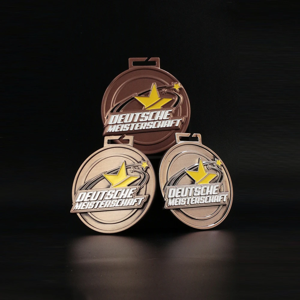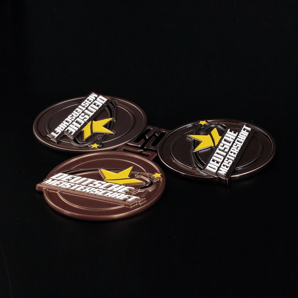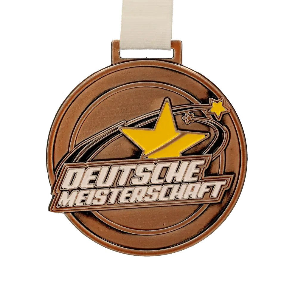 Las animadoras que participan en el Deutsche Meisterschaften han perfeccionado el difícil arte de animar a los equipos. Para ellas, hemos preparado originales medallas personalizadas en color marrón. Las medallas tienen forma redonda y en su superficie presentan numerosos relieves que se pueden sentir al tacto. Además, rellenamos estos detalles con esmalte de colores, lo que atrae la atención y realza la belleza de la medalla. Todo el conjunto brilla suavemente con la luz, haciendo que las medallas para animadoras destaquen en cualquier condición.