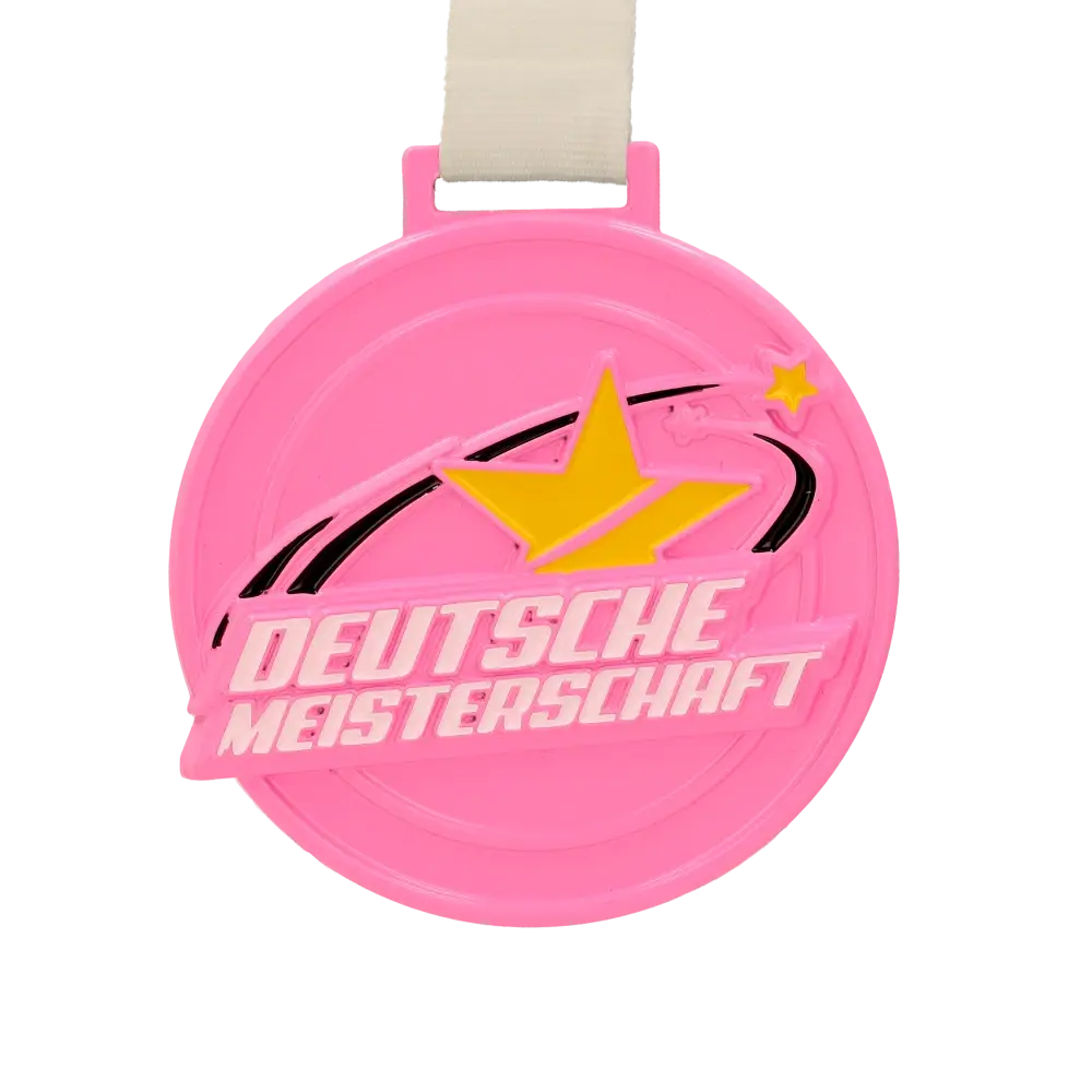 Las animadoras que participaron en el Deutsche Meisterschaften han dominado el arte de animar a los equipos, una tarea nada sencilla. Para ellas preparamos originales medallas personalizadas en color rosa. Las medallas personalizadas tienen forma redonda y, en su superficie, presentan numerosas decoraciones que se pueden percibir al tacto. Además, rellenamos estas decoraciones con esmalte de colores, que atrae la mirada y hace que la medalla luzca realmente hermosa. El conjunto brilla suavemente a la luz, por lo que las medallas para animación sorprenden por su aspecto en cualquier condición.