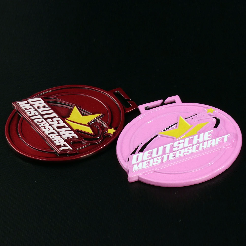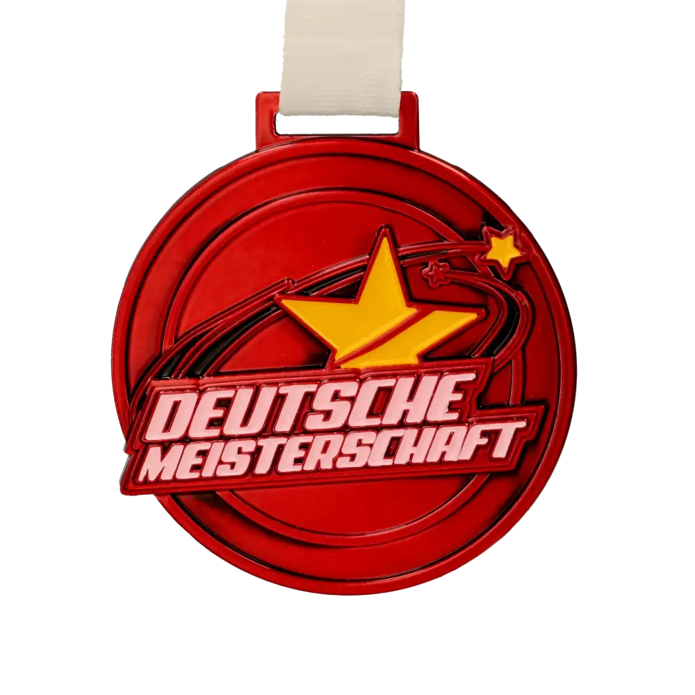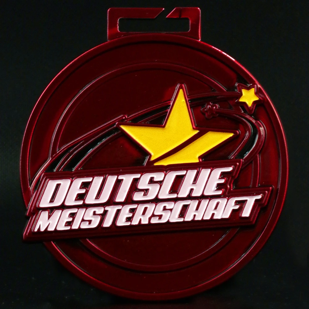 Las animadoras que participaron en el Deutsche Meisterschaften han dominado el arte de animar a los equipos, una tarea nada sencilla. Para ellas, preparamos originales medallas personalizadas en color rojo. Las medallas tienen forma redonda y, en su superficie, presentan numerosas decoraciones que se pueden percibir al tacto. Además, rellenamos estas decoraciones con esmalte de colores, que atrae la mirada y hace que la medalla luzca realmente hermosa. El conjunto brilla suavemente a la luz, por lo que las medallas para animación sorprenden por su aspecto en cualquier condición.