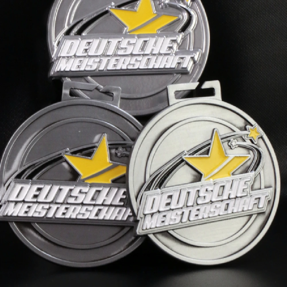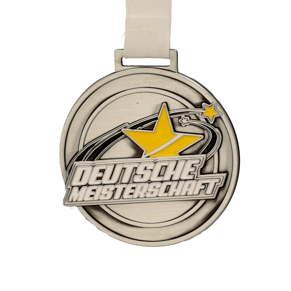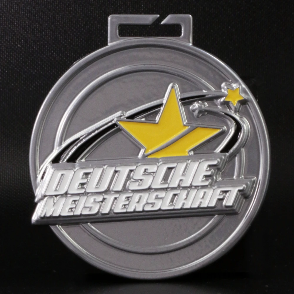 Las animadoras que participaron en Deutsche Meisterschaften han demostrado su habilidad para animar a los equipos, lo cual no es tarea fácil. Para ellas, hemos preparado originales medallas personalizadas en color plata. Tienen forma redonda y, en su superficie, numerosas decoraciones en relieve que se pueden sentir al tacto. Además, hemos rellenado estos detalles con esmalte de colores que atrae la atención y embellece aún más la medalla. Todo el conjunto brilla suavemente con la luz, lo que hace que las medallas para animadoras luzcan espectaculares en cualquier condición.