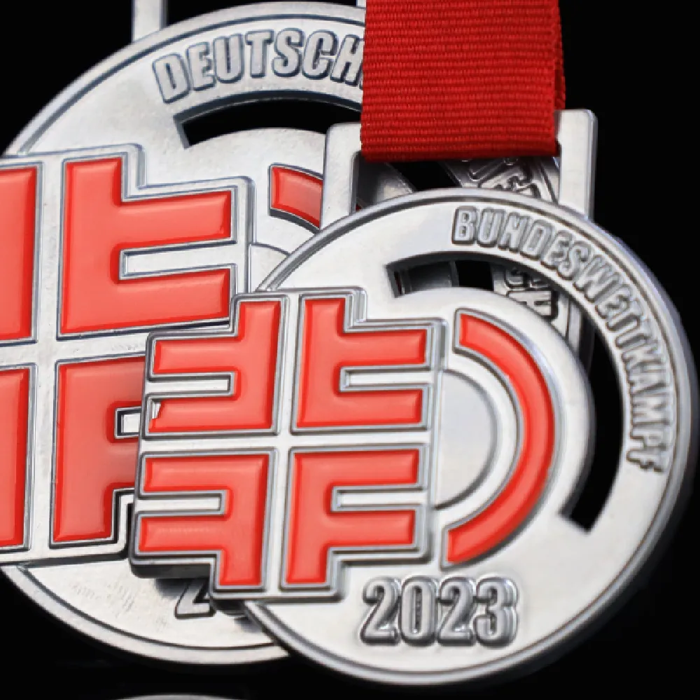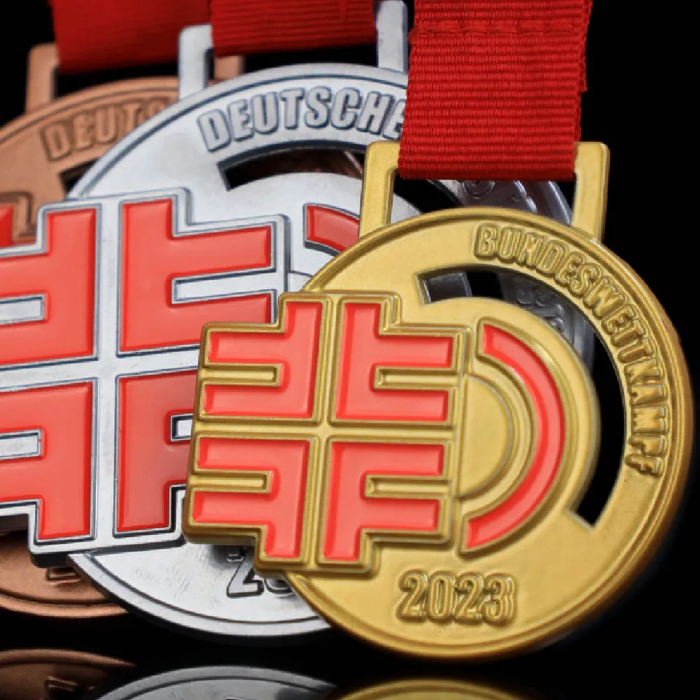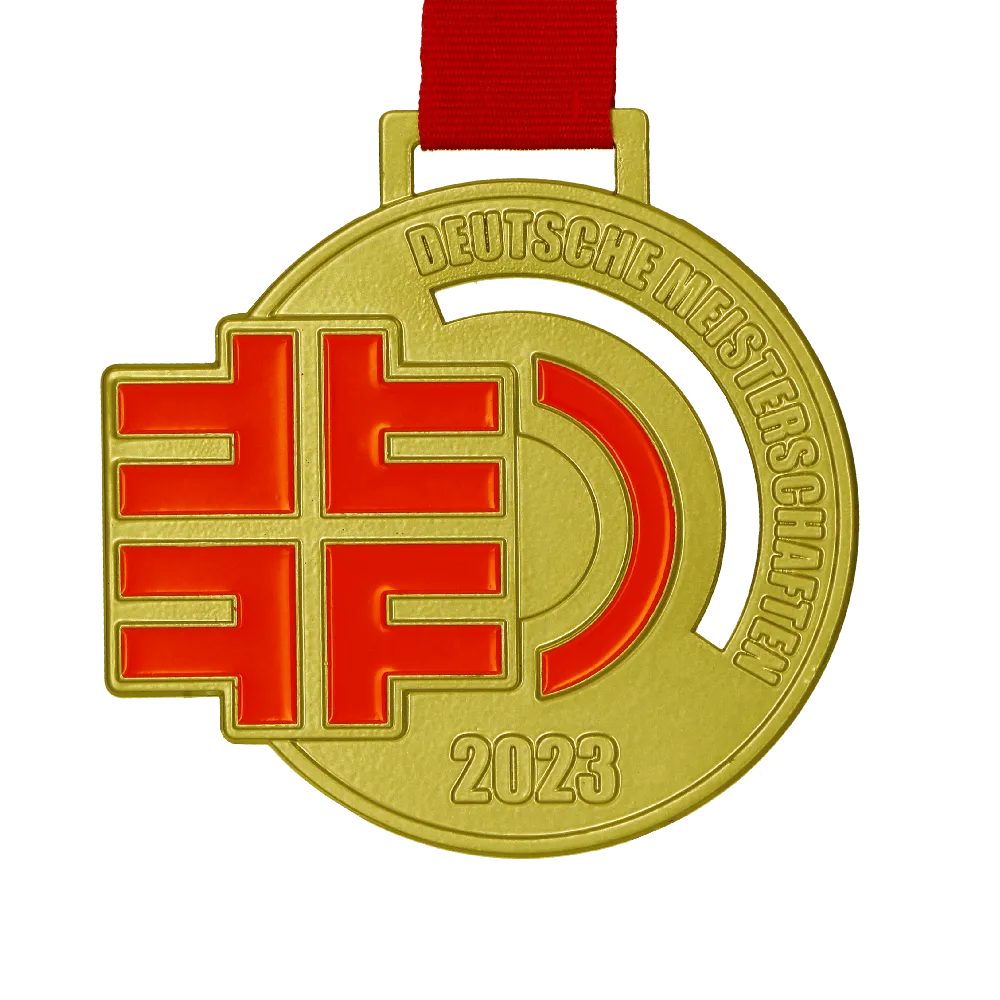 Winmed es un fabricante de premios con experiencia, presente en muchos eventos deportivos y especiales. Somos una empresa de confianza, como lo demuestra el hecho de que muchos clientes vuelven a nosotros para nuevos proyectos. Uno de ellos es el organizador del Deutsche Meisterschaften, para quien creamos medallas redondas fundidas con recortes únicos y logotipos en relieve. Fabricamos las medallas para carrera en dos tamaños y tres versiones clásicas: oro, plata y bronce. Cada una está cubierta con un esmalte rojo intenso que resalta el logotipo y atrae la atención. La superficie de la medalla también presenta decoraciones tridimensionales, haciendo que todo el diseño sea realmente hermoso.