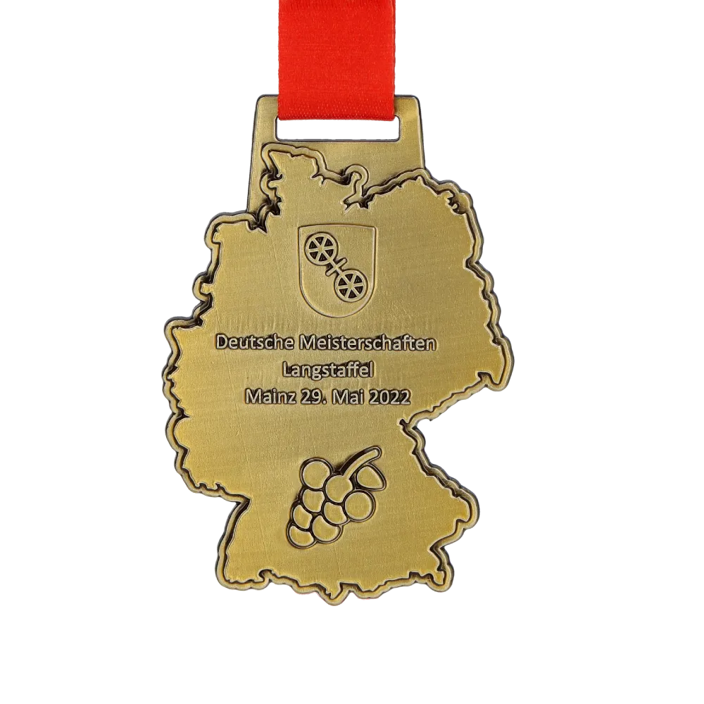 En nuestra oferta encontrarás muchas medallas preparadas para distintos eventos deportivos. Todas ellas tienen algo en común: fueron realizadas por encargo individual. Una de estas recompensas son las medallas para carrera del Deutsche Meisterschaften Langstaffel. Tienen una forma original que recuerda al mapa de Alemania. Además, son medallas de acero de doble cara, lo que significa que presentan decoraciones tridimensionales tanto en el anverso como en el reverso.