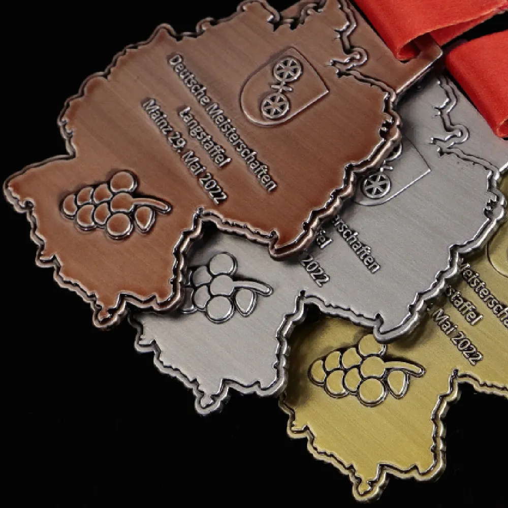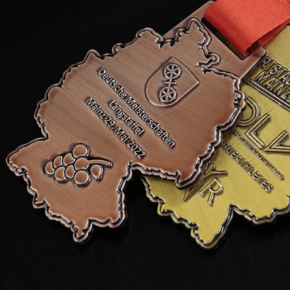 Double-sided cast medals in the shape of the map of Germany with three-dimensional decorations. We made the medal in three classic colours: gold, silver and bronze.