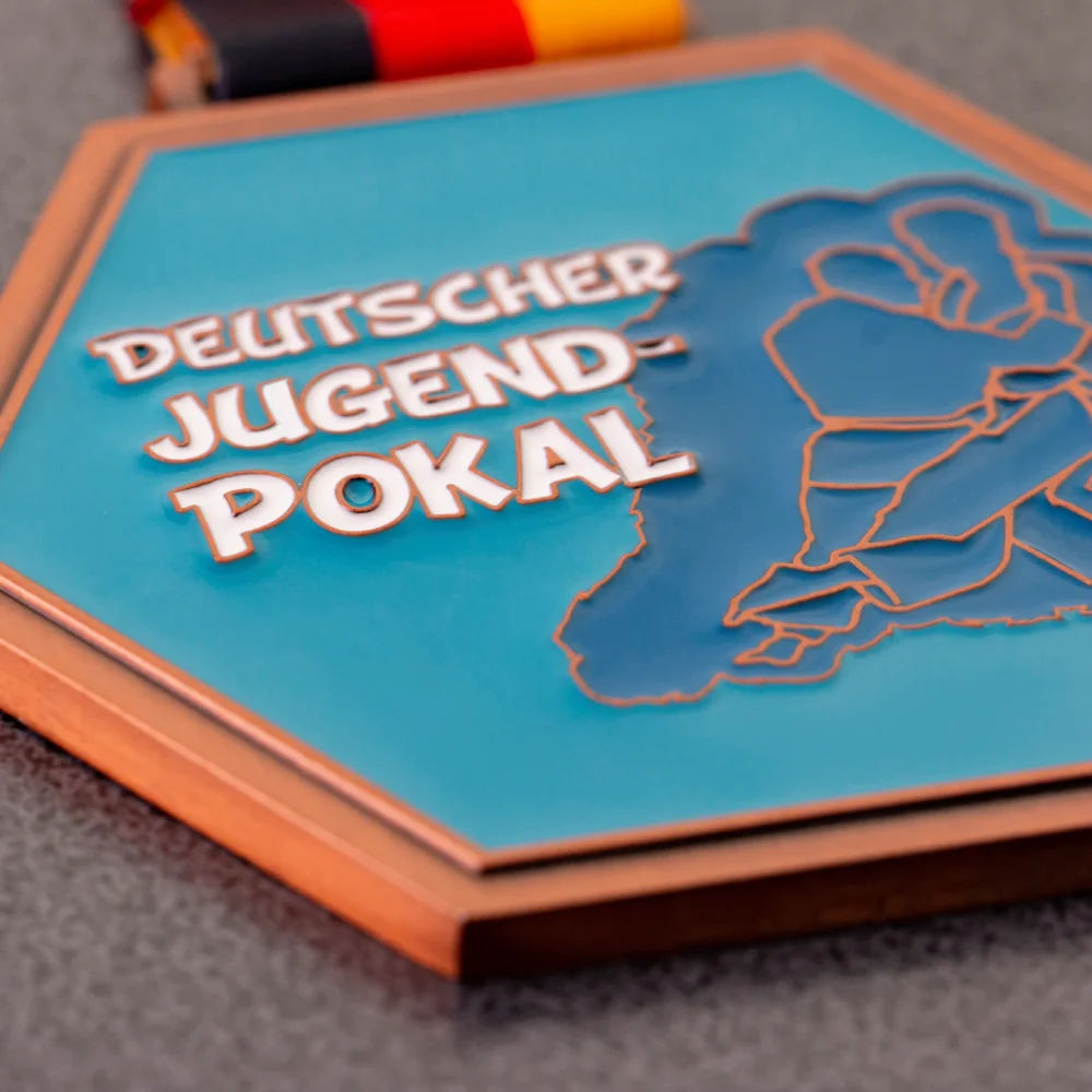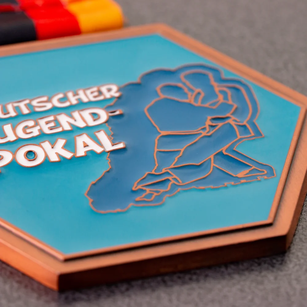 Casi cualquier objeto adquiere carácter gracias al color. Lo mismo ocurre con las medallas, que se pueden personalizar en color mediante impresión o esmalte. Para las medallas de judo del Deutscher Jugend-Pokal optamos por el esmalte, que incrustamos profundamente en la medalla.
