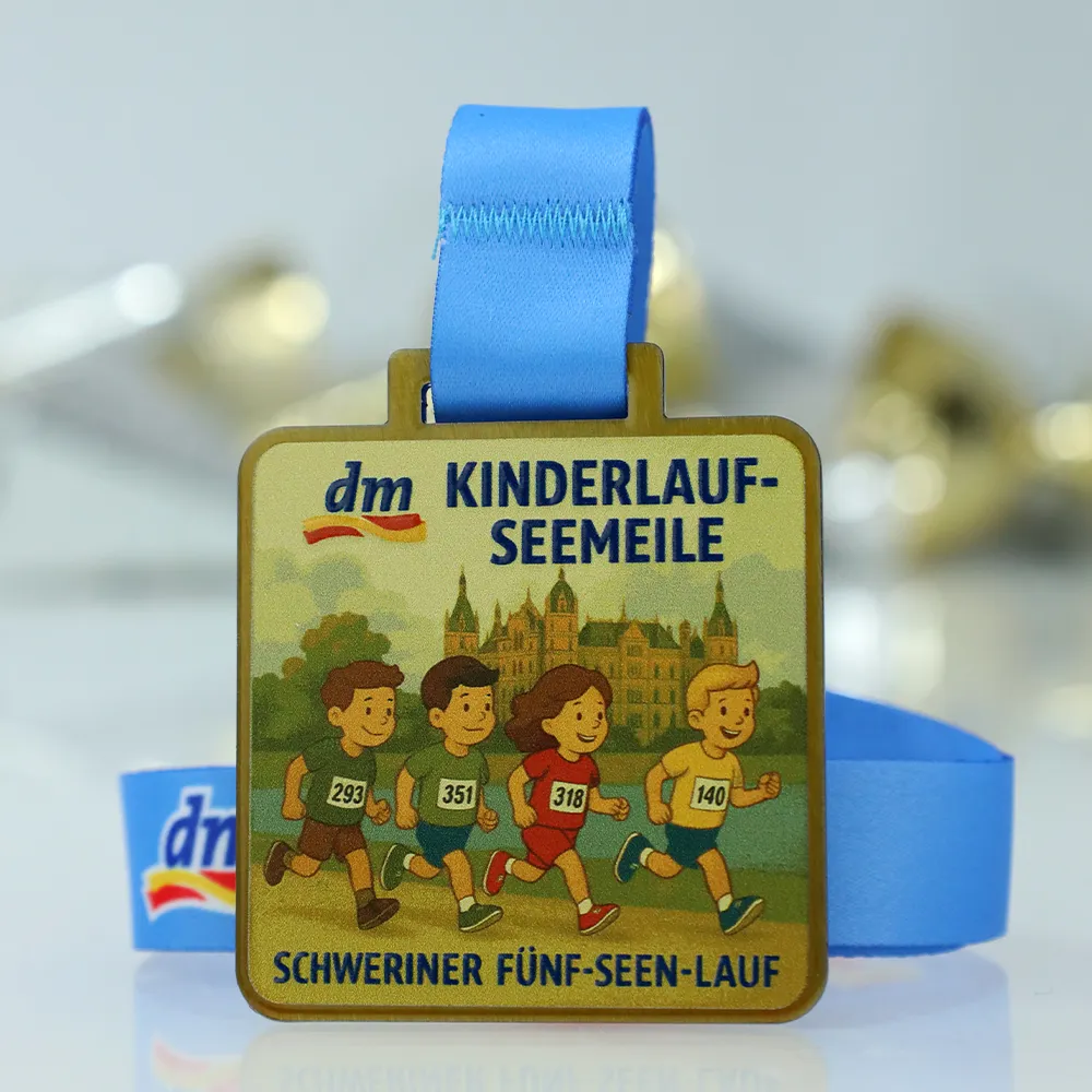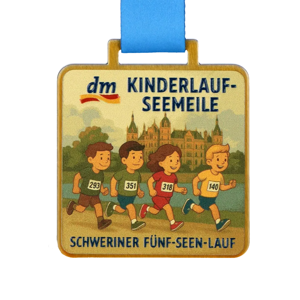 Diseñamos esta colorida medalla personalizada para dar realce a la competición DM Kinderlauf-Seemeile. Fabricada en acero duradero, destaca por su forma cuadrada segura y un gráfico pintoresco de un castillo y niños realizado con tecnología de impresión UV. El diseño combina estética con solidez, integrándose perfectamente en el carácter del evento Schweriner Fünf-Seen-Lauf. Es la elección perfecta para organizadores que buscan premios atractivos y duraderos para los más jóvenes.