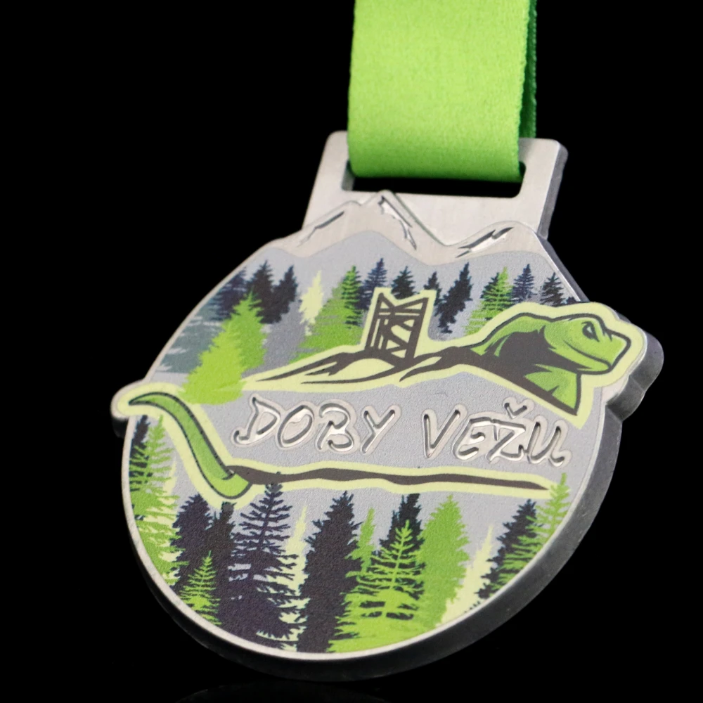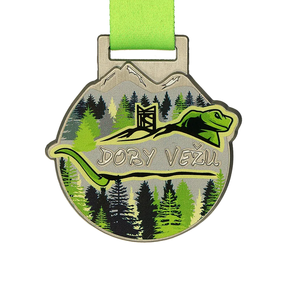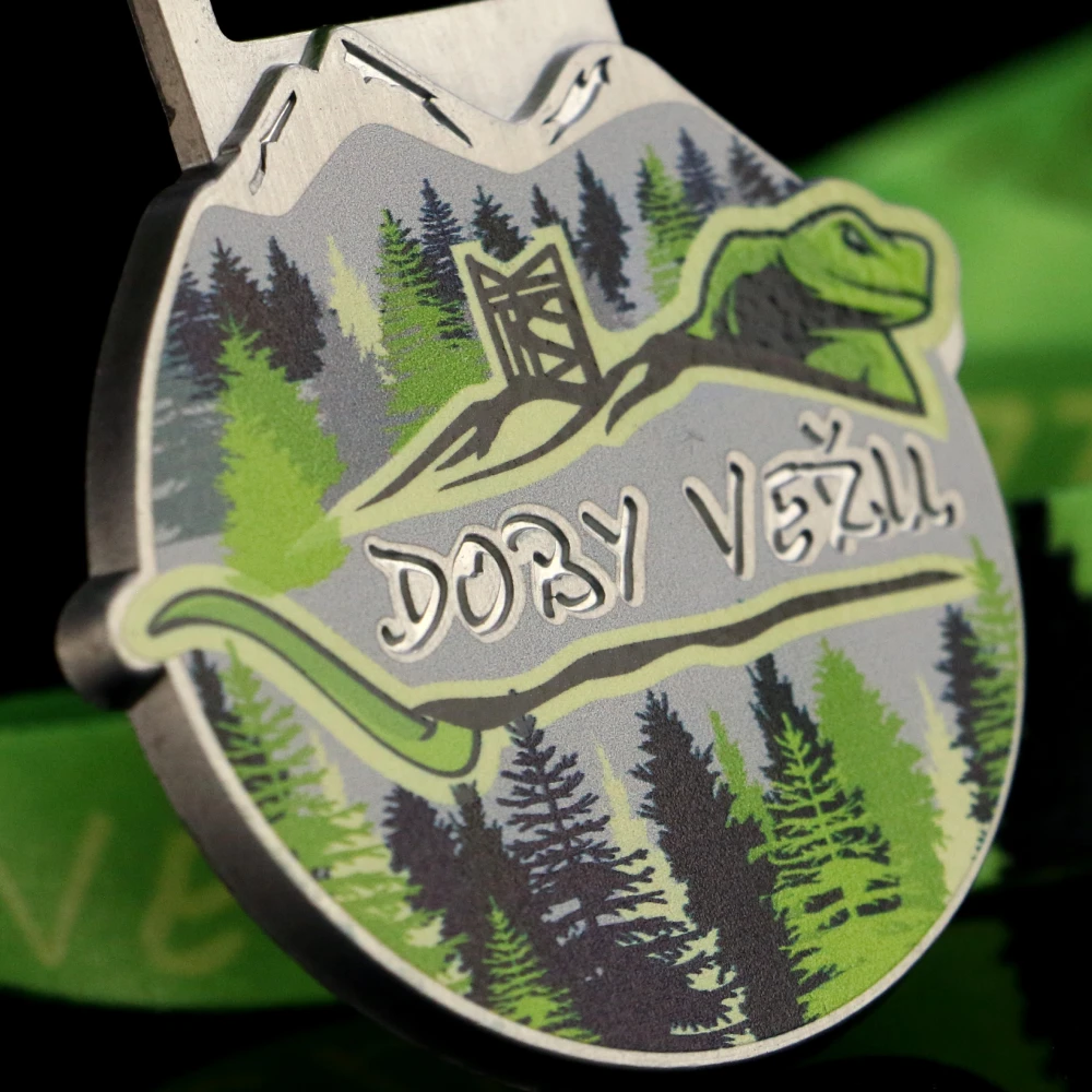 A los corredores les gustan los retos y participan con entusiasmo en carreras de obstáculos. En Winmed, tampoco tememos a los desafíos, por eso estábamos preparados para crear originales medallas fundidas impresas para la carrera Doby Vezu. Tienen una forma redonda que conseguimos gracias a una matriz creada especialmente para este proyecto. Además, en el centro de la medalla colocamos una ranura precisa con el nombre del evento. Alrededor, añadimos una impresión a color en varios tonos de verde y negro, con un motivo que combina perfectamente con la temática del evento. Todo se completa con una cinta de sublimación personalizada en un intenso color verde.