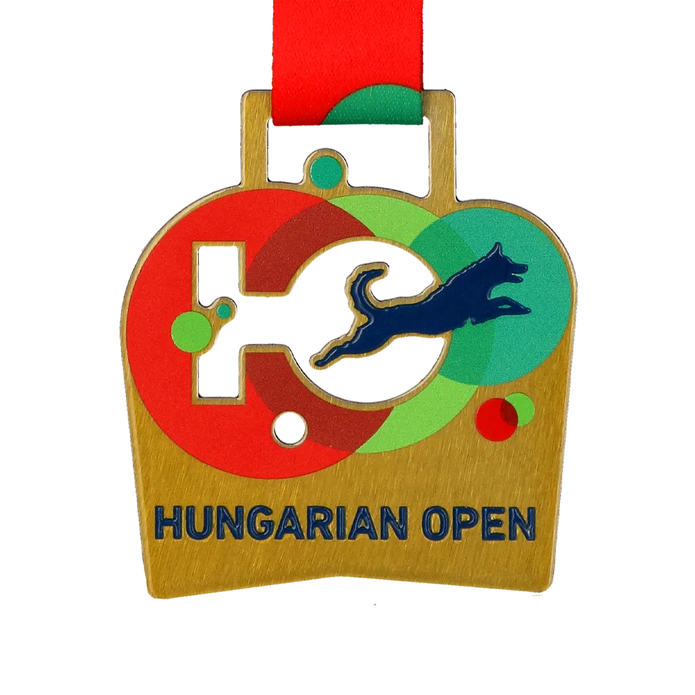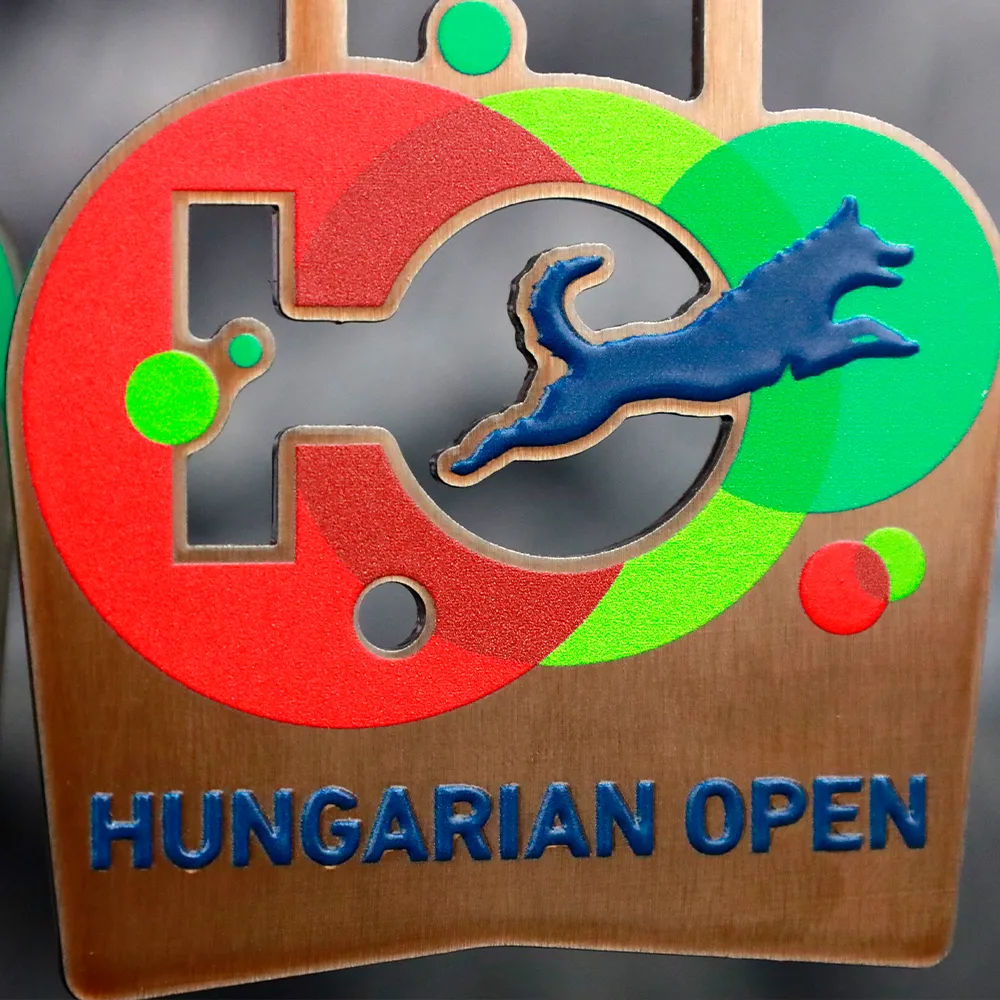 Una medalla personalizada para el DogFlow Hungarian Open. La forma y los recortes de la medalla están cortados con láser con gran precisión. Las decoraciones de la medalla se realizan con impresión UV.