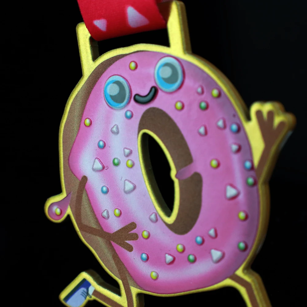 Quienes lograron llegar a la meta de la carrera Donut Who Run sin duda merecen un dulce donut. Sin embargo, esta vez, en lugar de un tentempié azucarado, recibieron medallas conmemorativas que abren el apetito al instante. Estas medallas personalizadas están hechas de acero y las diseñamos con forma de donut. El diseño con temática de postre, combinado con detalles de carrera, encaja perfectamente con el ambiente de la competición y hace una ingeniosa referencia al nombre del evento. Además, los colores vibrantes y las decoraciones tridimensionales que imitan virutas de azúcar hacen que las medallas para carrera sean realmente memorables. Todo ello se complementa con una cinta de sublimación que encaja a la perfección con el diseño del premio.