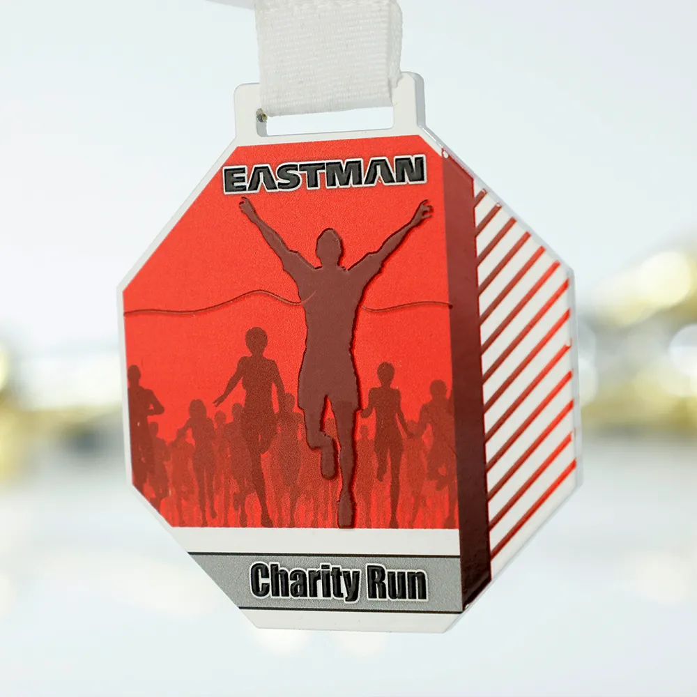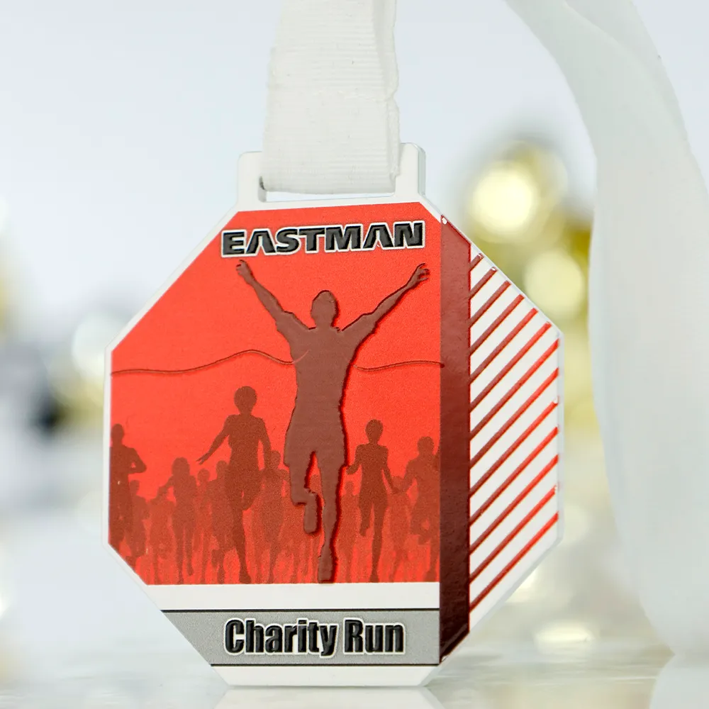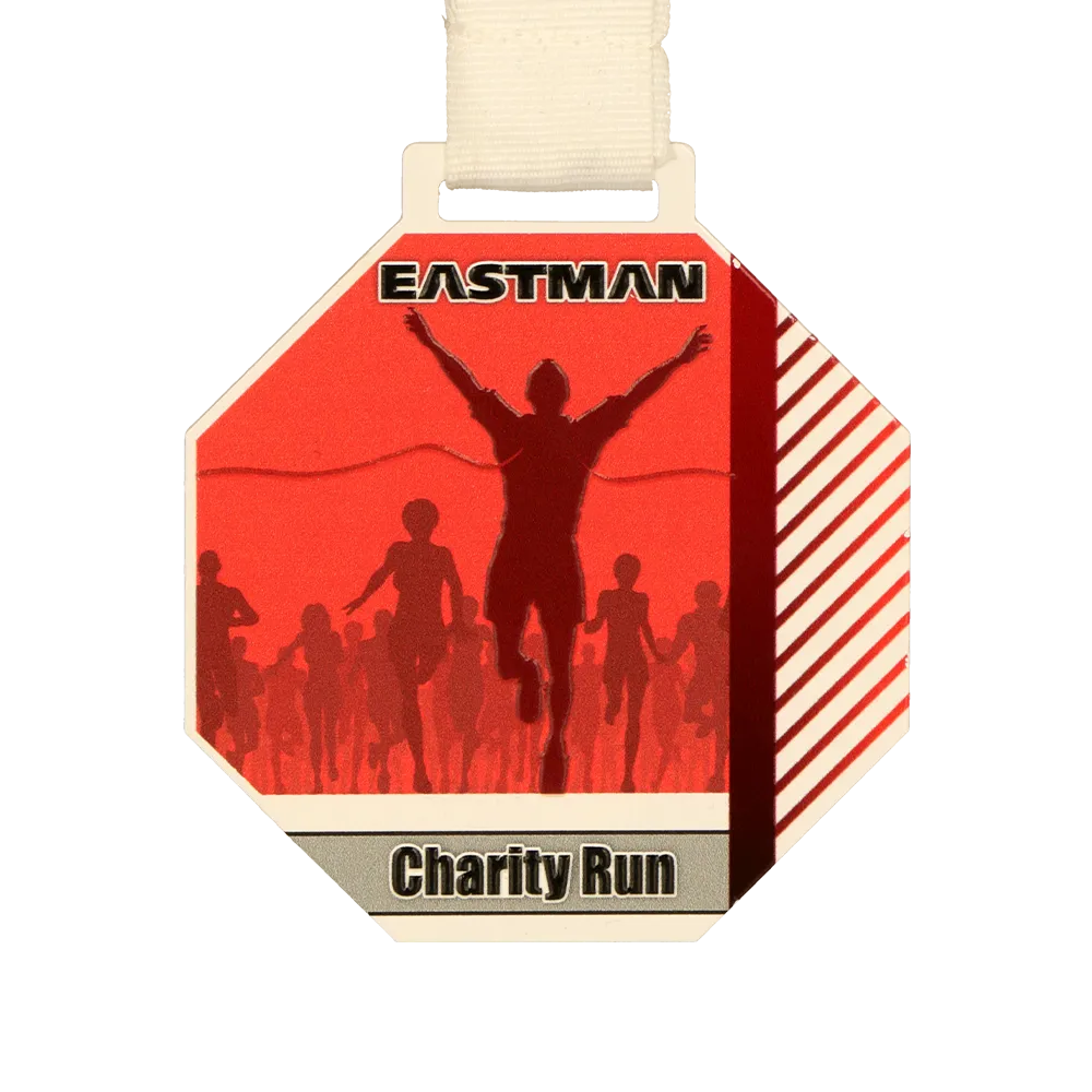 Medalla personalizada de acero con impresión UV a color. Tiene forma de hexágono y muestra corredores con la silueta de un ganador en primer plano. Está diseñada en rojo y blanco. La personalización incluye el nombre de la empresa Eastman y el evento Charity Run. Medalla destinada a carreras masivas y eventos benéficos.