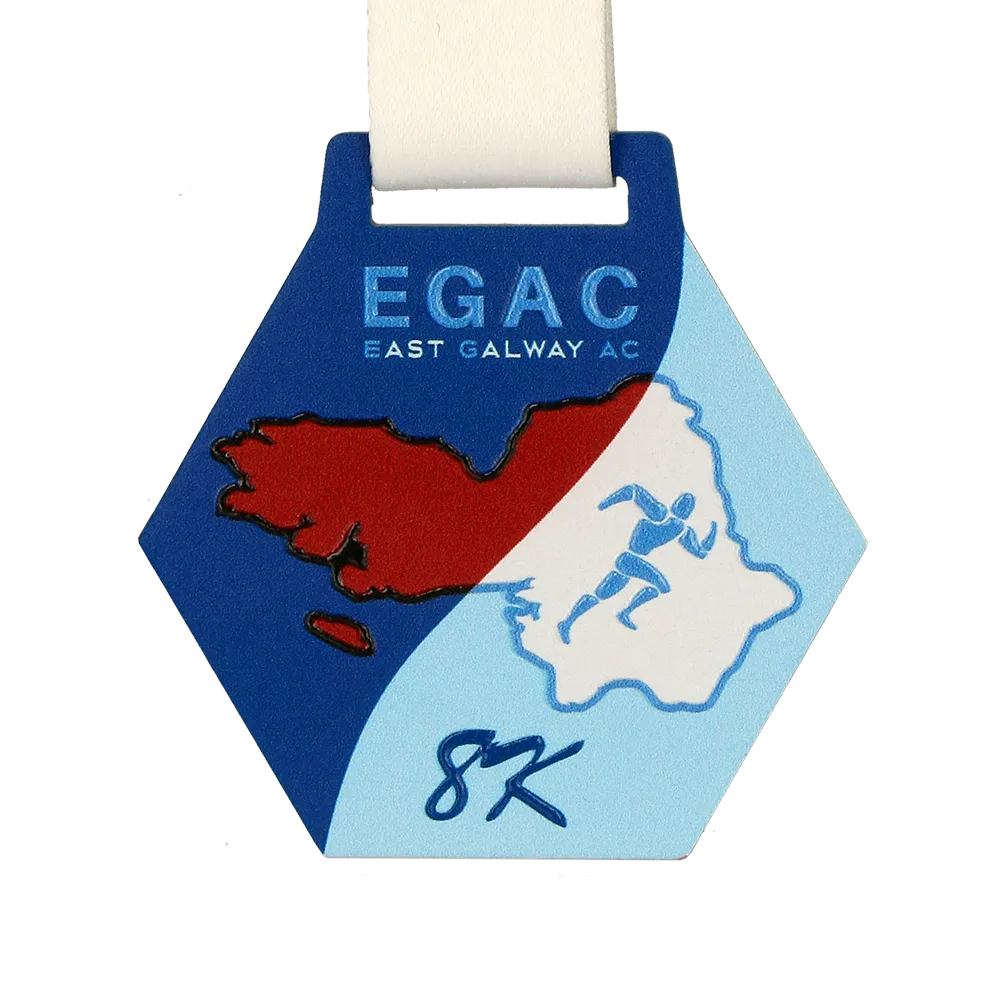 Presentamos nuestra medalla personalizada diseñada especialmente para el evento Egac East Galway. La medalla está decorada con un gráfico distintivo que muestra los contornos de la región de Galway. También presenta la imagen de un corredor, simbolizando el carácter deportivo del evento.