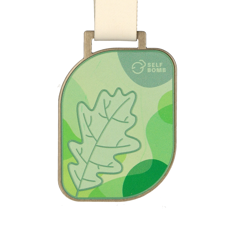 Una medalla personalizada creada para el evento Életmód Program es un recuerdo único para los participantes. La medalla presenta un delicado motivo de hoja de roble, que simboliza la naturaleza y un estilo de vida saludable. Los gráficos e inscripciones en color se aplicaron mediante impresión UV, otorgando a todo el diseño un aspecto moderno.
