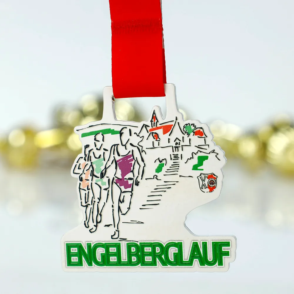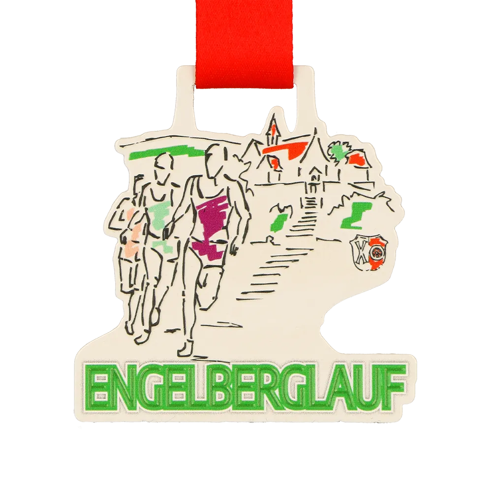 Medalla personalizada realizada para los participantes de la carrera Engelberglauf. El anverso muestra una imagen colorida de corredores frente al perfil urbano dibujado de la ciudad, con el nombre del evento en verde. Los detalles y colores se aplican mediante impresión UV duradera.