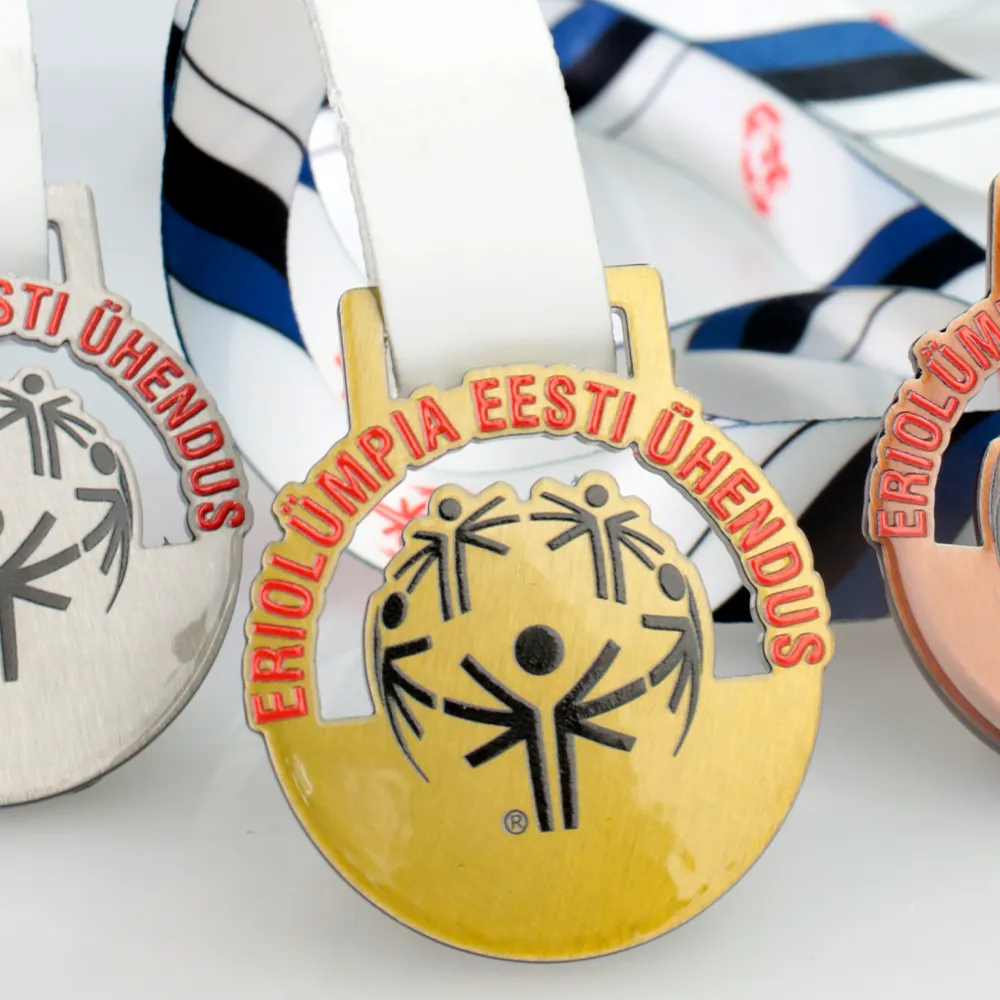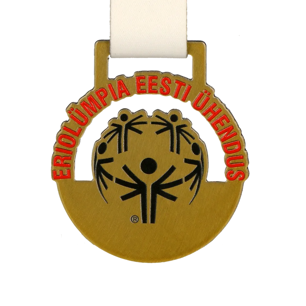 Una medalla personalizada que creamos para el evento Eriolümpia Eesti Ühendus destaca por su diseño sencillo pero llamativo. Cortamos la medalla con láser, lo que permitió una forma precisa y un acabado perfecto. El logotipo y las inscripciones se aplicaron mediante tecnología de impresión UV.