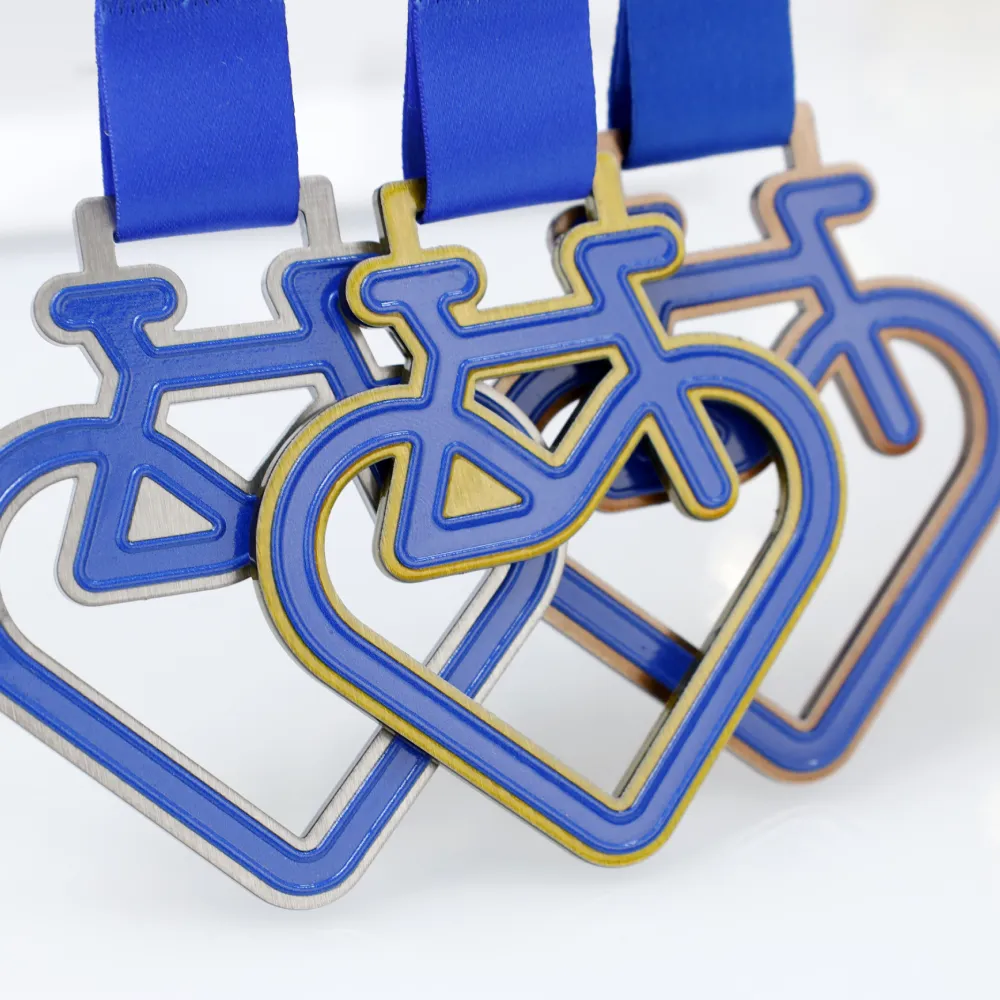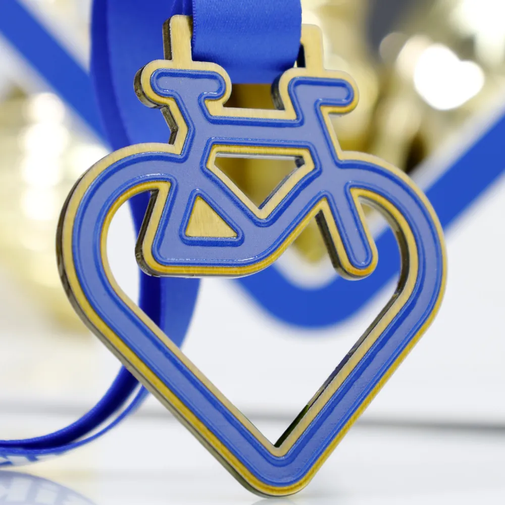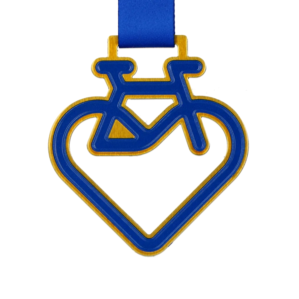 Una medalla personalizada especialmente creada para un evento de ciclismo. La forma original que combina un corazón y una bicicleta resalta la pasión por el ciclismo. Los colores son azules con un acento dorado, y el motivo gráfico se realiza con impresión UV. Incluye una cinta azul a juego.