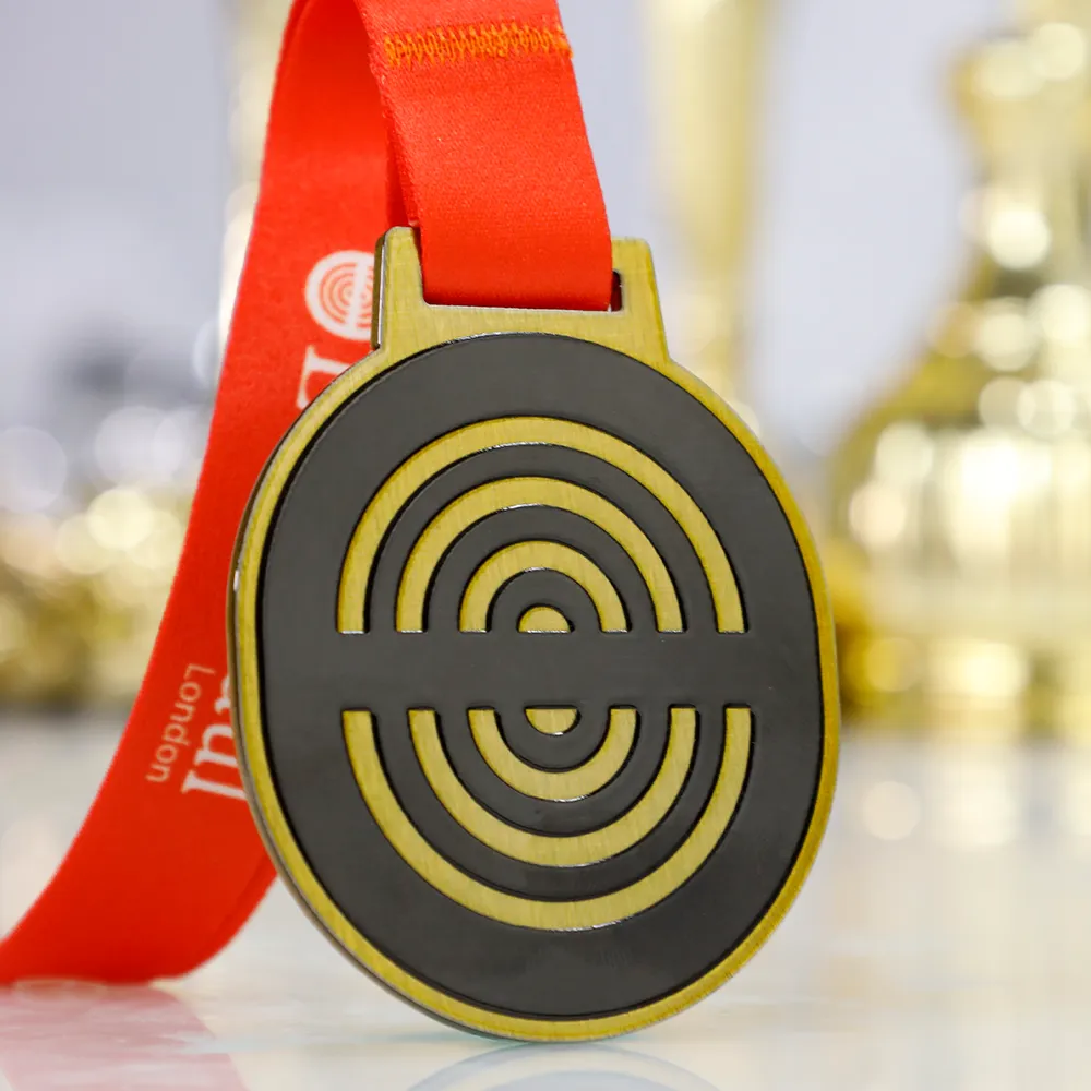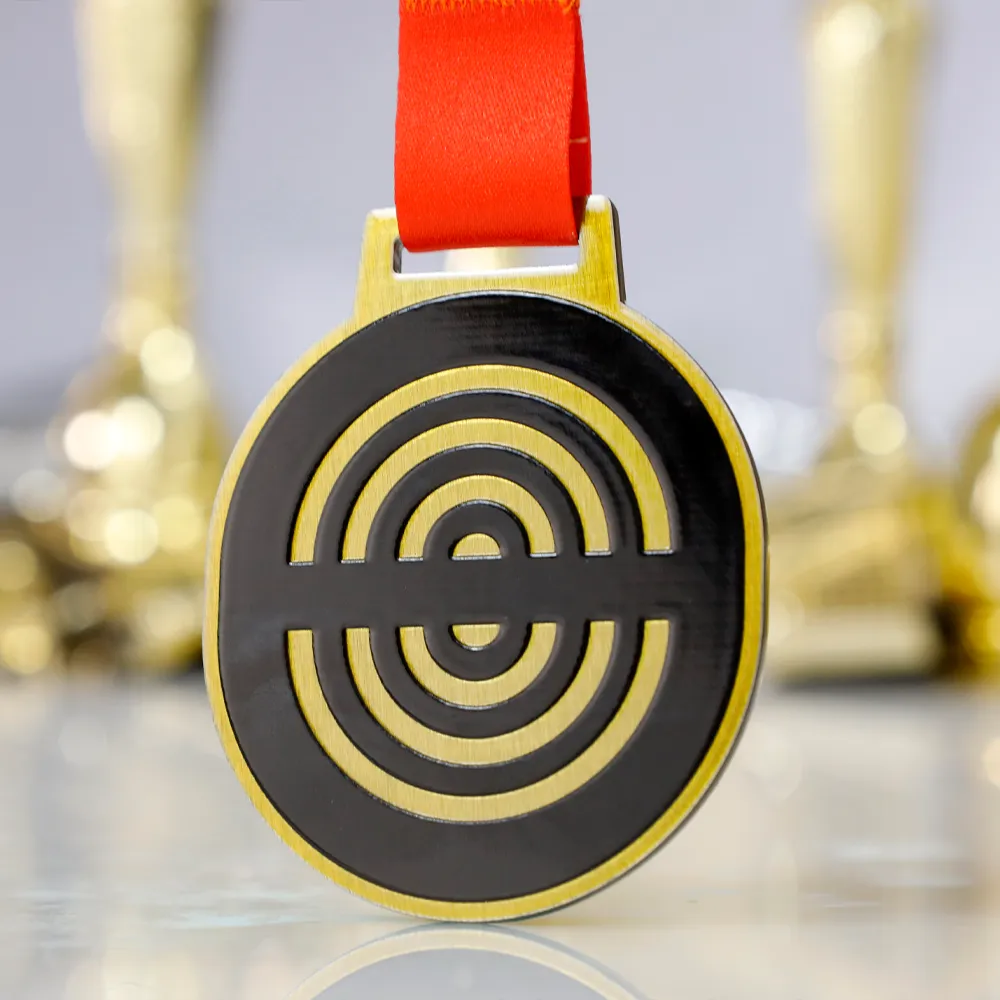 Unas medallas personalizadas diseñadas para competiciones de esgrima. El diseño hace referencia a un escudo de esgrima en una elegante combinación de negro y dorado. El gráfico en relieve y minimalista resalta el estilo del evento. La medalla se completa con una sólida cinta roja.