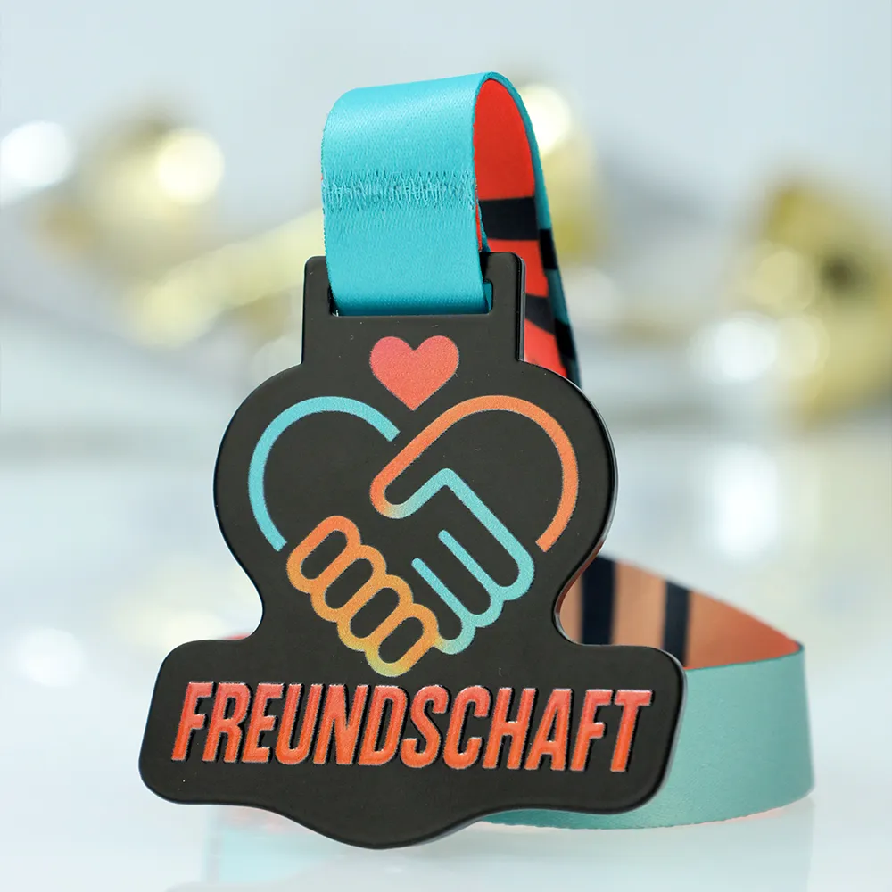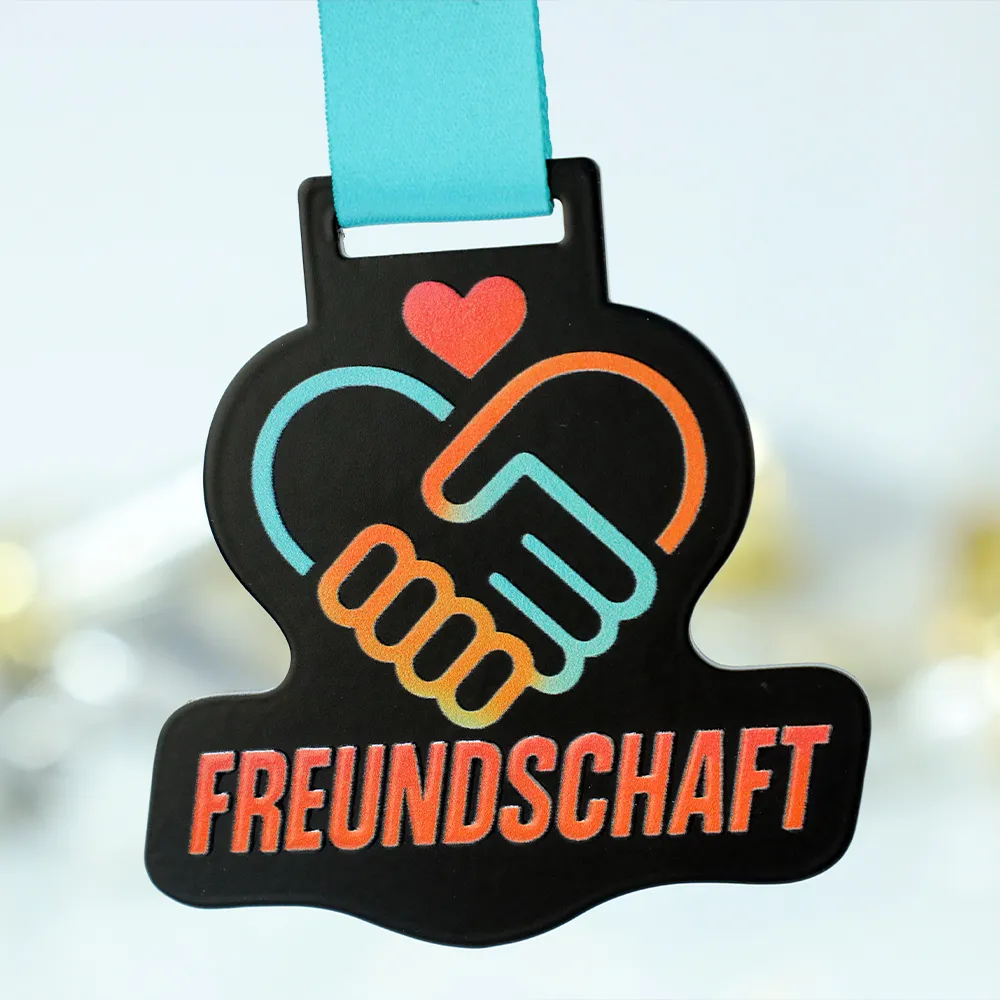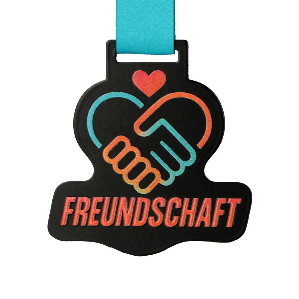 Esta llamativa medalla fundida, realizada para la iniciativa Freundschaft Medaille, es un ejemplo de un enfoque moderno en la decoración de medallas. La base es un metal cortado con precisión en un color negro profundo, que ofrece un excelente contraste para los gráficos aplicados mediante el método de impresión UV. Gracias al uso de materiales de alta calidad, tanto la forma irregular de la medalla como la inscripción distintiva son resistentes a la abrasión, conservando su frescura de fábrica durante años.