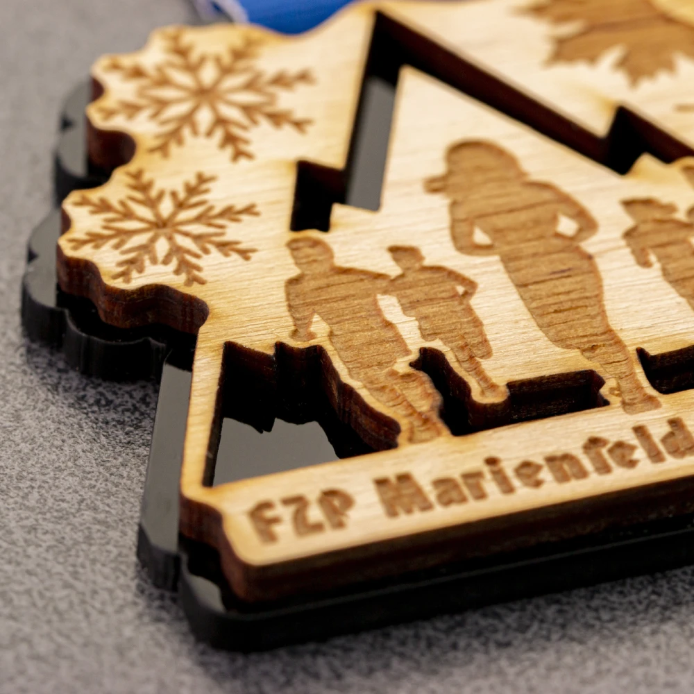 Medalla de madera fabricada en contrachapado, con fondo negro de acrílico. La forma está cortada con láser y el diseño se ha realizado mediante grabado. Representa siluetas de corredores sobre un fondo de montañas, copos de nieve y hojas de arce. En la parte inferior está grabado el nombre del evento.